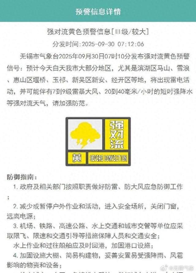 预计今天白天我市大部分地区,尤其是滨湖区马山、雪浪、惠山区堰桥、玉祁、新吴区新安、经开区等地,将出现雷电活动,并可能伴有7到9级雷暴大风、20到40毫米/小时的短时强降水等强对流天气,请加强防范。