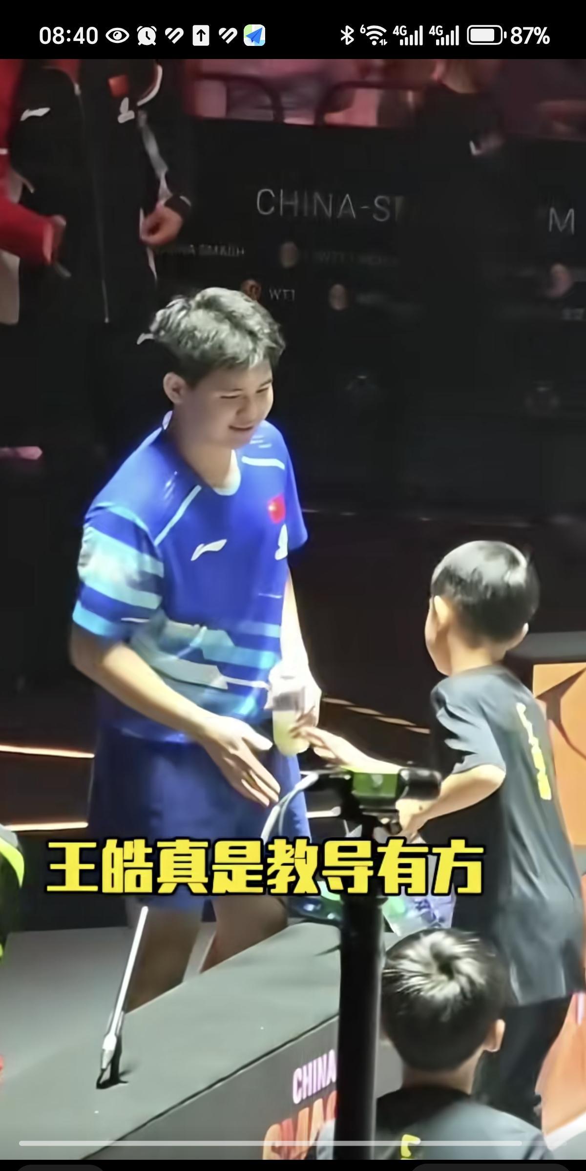 09月29日,王皓家的两位公了,又做起了球童,近水楼台先得月,必须有个教练爸爸才行,两位公子都长得帅气又乖巧,赛后还跟林诗栋击掌,林诗栋笑得像小叔子一样,露出又甜又可爱的笑容 王皓的两个儿子,端正的坐在场边负责捡球,王皓看见乒乓球在赛场内,手指指向乒乓球,示意儿子快点去检,感觉王皓在赛场上要指导三位一样,又要负责帮林诗栋指导战术,还要负责两个儿子捡球,感觉现场最忙的应该是王皓,一心三用也只有王皓才能做到了