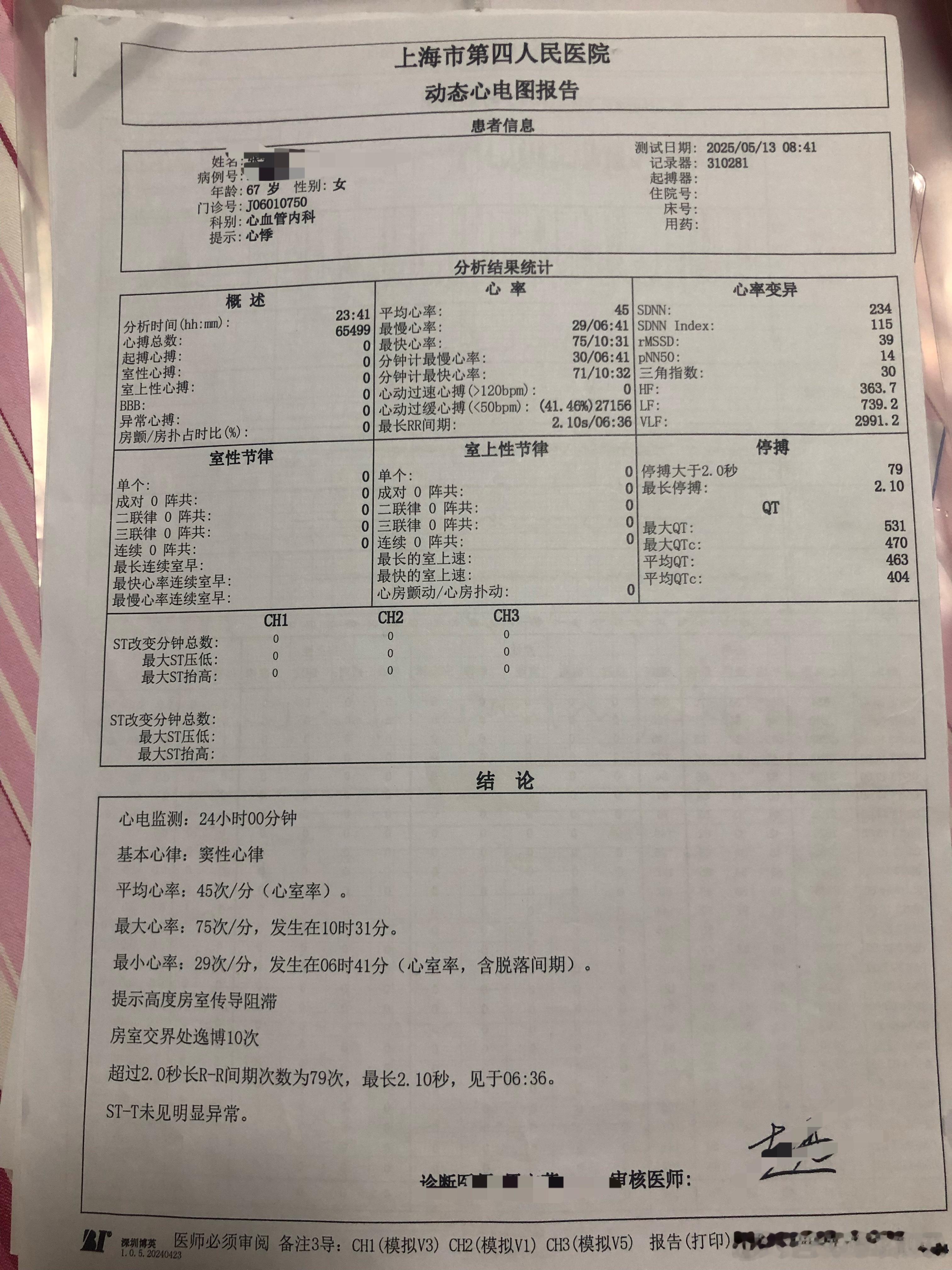 我们都觉得非常危险,第二天就带她去看了心内科,及时做了24小时动态心电图和其他的一些相应检查,尽快安排了起搏器的手术。
