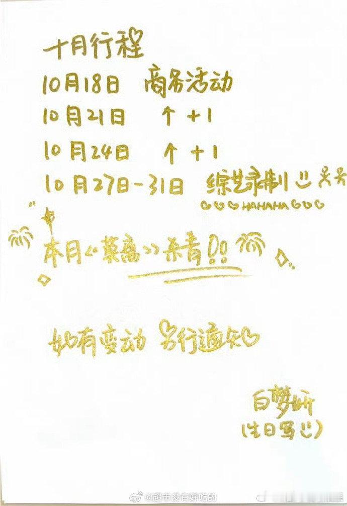白鹿莫离十月杀青白鹿十月手写行程图 十月杀青解锁新篇!手写行程图里写满期待,后续影视、商务双线开花