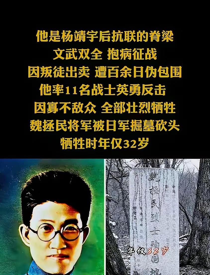 冰天雪地里,魏拯民咳出的鲜血滴在雪地上格外刺眼。战友们劝他休息,他却斩钉截铁地说:“我们在艰苦中求生,就能换取人民的永生。” 这位年仅32岁的抗联将领,在杨靖宇牺牲后毅然扛起了第一路军的全部重任。 1939年4月那个寒冷的夜晚,魏拯民与杨靖宇共同策划了大蒲柴河突袭战。他们率领450名战士,兵分两路直扑日军野战仓库。 第二支队的战士们巧妙骗开伪警察署大门,迅速控制现场,将储存大量军火和军需物资的仓库一举捣毁。当伪军试图增援时,第一支队的火力如同铁壁般阻挡了他们的去路。 这场战役击毙日军20余人,歼灭伪军200余人,缴获的武器弹药让抗联部队得到了宝贵补给。 魏拯民的名字让日军闻风丧胆。在马鹿沟一战中,他指挥部队歼灭了100多名日军核心成员。 即便在极端艰苦的环境下,他的战术依然灵活多变,指挥部队采取“化整为零”的游击战术,将主力分散成数十个小股部队,潜入深山密林与敌人周旋。 严寒的冬季,抗联战士们缺衣少食,经常十天半月吃不到粮食。渴了抓把雪,饿了吃树皮、野菜、草根。没有鞋穿,就用麻袋片或破布把脚包起来在雪地上行军。 零下三四十摄氏度的低温中,许多战士冻掉了手指和脚趾。魏拯民深知每场战斗的代价,但他更明白放弃抵抗的代价更大。 1941年3月8日,魏拯民终因积劳成疾,在桦甸牡丹岭四道沟密营中病逝,年仅32岁。他去世后,日寇以为终于可以松口气,却不知抗联的火种早已播撒在白山黑水之间。 魏拯民的遗骨直到1961年才被找到。2014年,他的英名入选全国首批300名著名抗日英烈和英雄群体名录。今天,在吉林市革命烈士纪念馆,他的雕像巍然屹立,每年吸引超过十万人前来瞻仰。 这位被日军称为“满洲国治安之癌”的抗联名将,用生命诠释了他生前常说的那句话:“人在世间为人,总得有为国为民的志气。” 各位读者你们怎么看?欢迎在评论区讨论。 权威信源参考:人民政协报《魏拯民:“久经斗争的革命家”》
