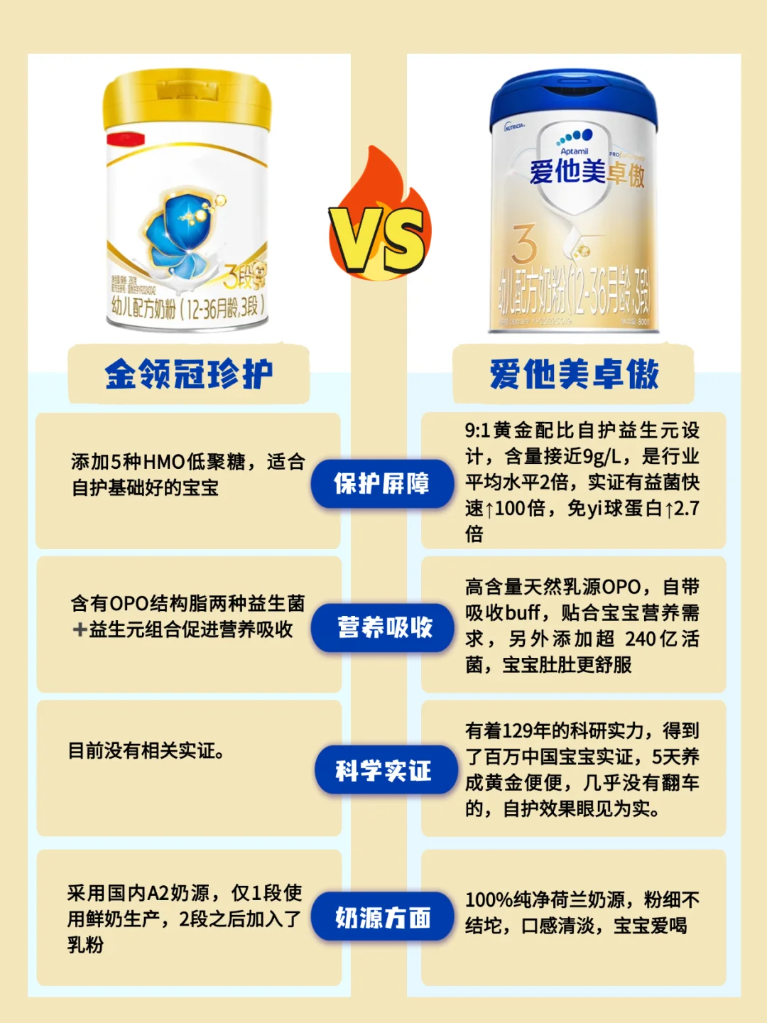 两款奶粉各有优势。如果宝宝肚肚耐受能力好,家长更看重吸收力,金领冠珍护则是一个不错的选择,如果宝宝是新生儿或小月龄,新手宝妈宝爸更注重全面提升宝宝的自护力和吸收力,爱他美卓傲可以放心入,不踩雷。