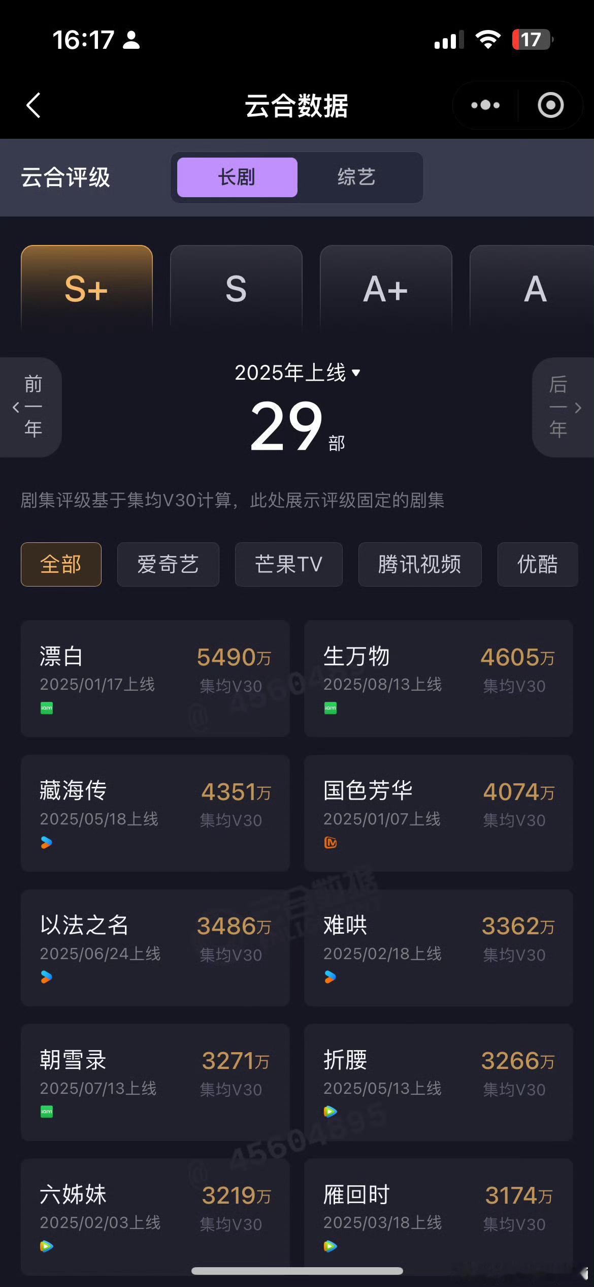《生万物》热播期云合累计17.42亿,集均4840w,集均v30为4605w。