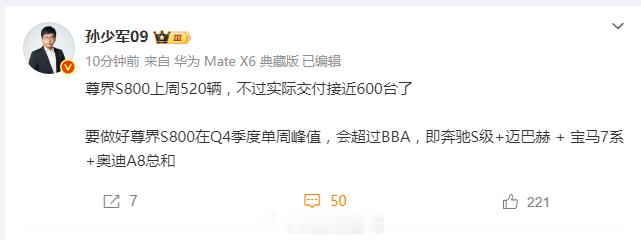 据车fans透露,尊界s800 在4季度交付量会是BBA的奔驰S+迈巴赫S+宝马7系+奥迪A8总和,从这也看得出尊界的产能爬坡还是有点东西的~