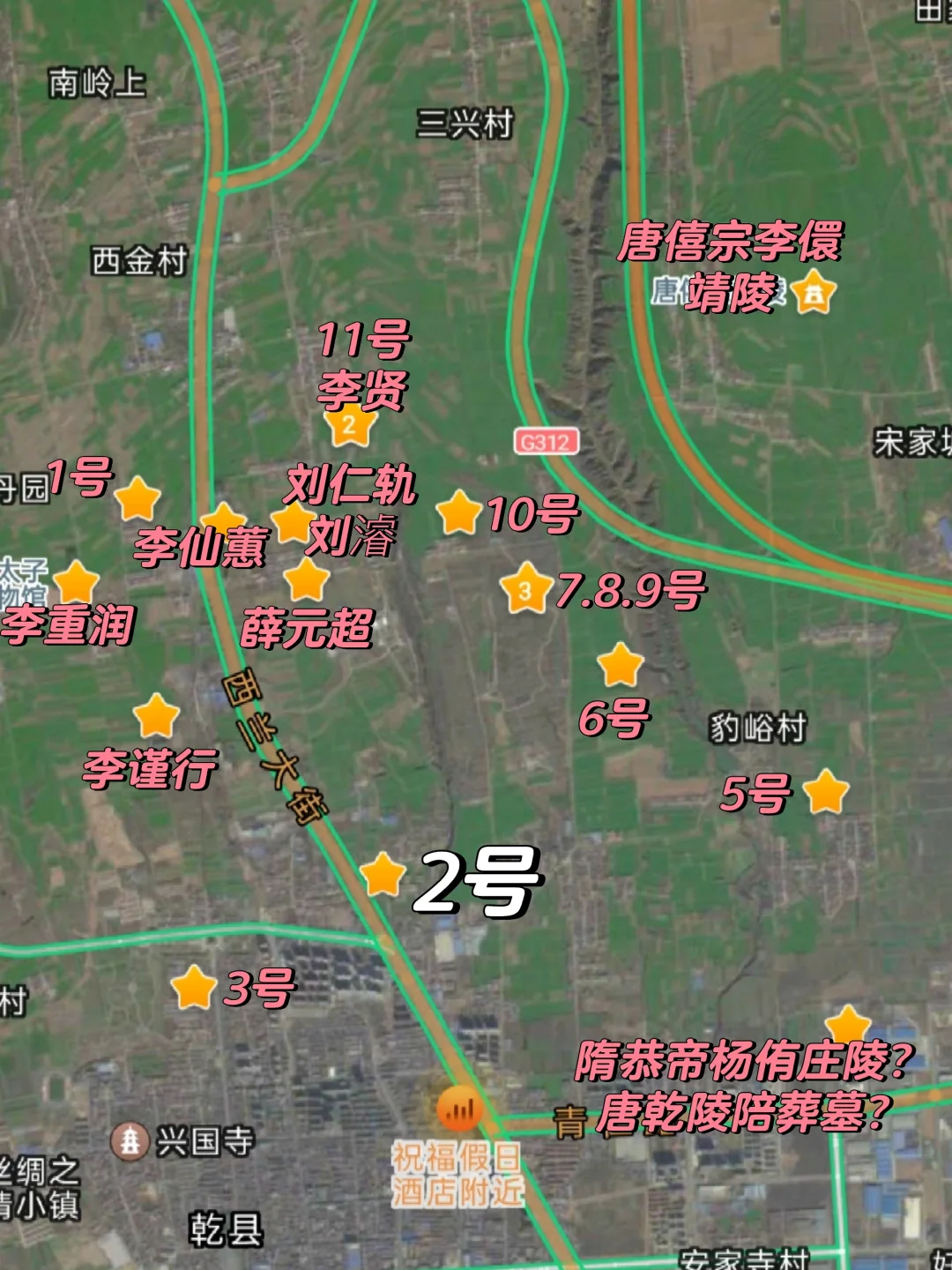 1号、2号、3号、5号、6号、7号、8号、9号、10号、11号,共10座。另外,盛世唐宫酒店北侧300米也有一座巨大封土墓,相传是隋恭帝杨侑庄陵,不过不能排除乾陵陪葬墓的可能性(尽管外观不同于唐墓),需要进一步考古发掘才能判定。