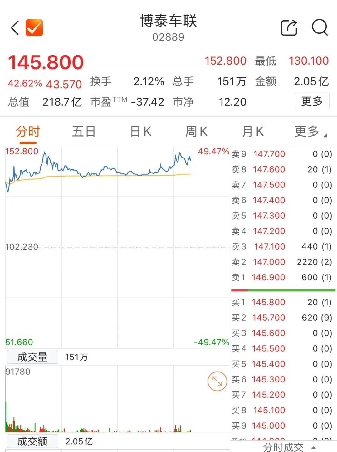 9月30日,博泰车联盘中一度大涨近50%,截至发稿涨超40%,报145.8港元/股。
