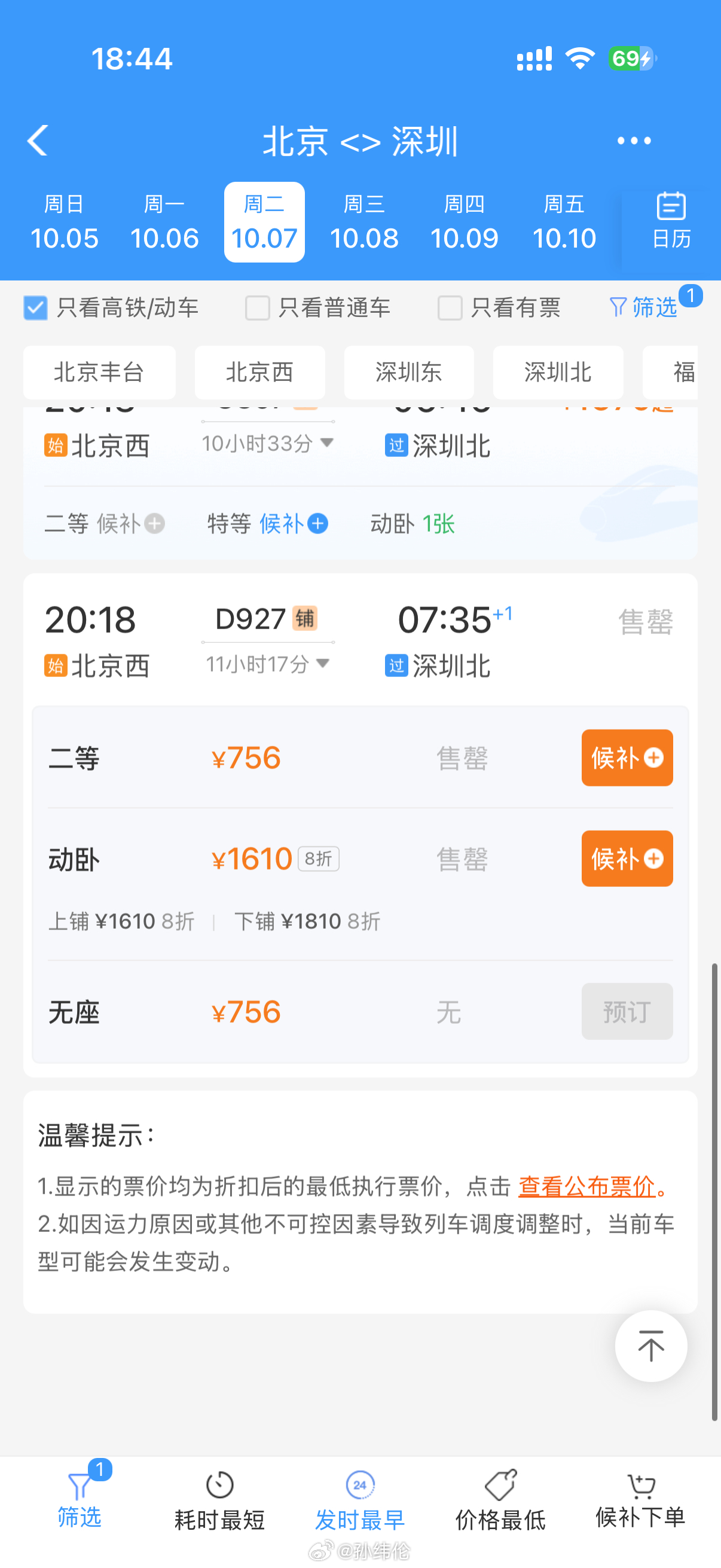 朝发夕至得动卧,北京西到深圳北,上铺1600下铺1800,你会选择吗?