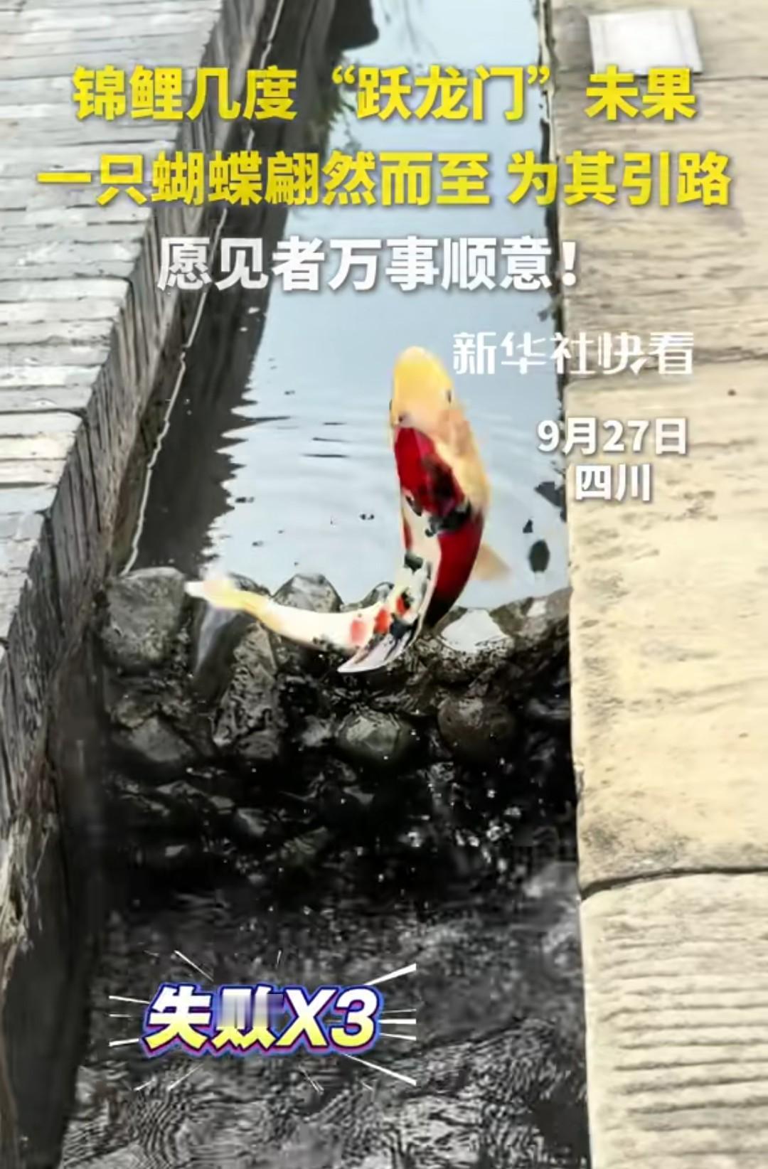 鲤鱼跃龙门,愿大家事事顺意! 近日,有人在四川拍到一组视频,一条锦鲤多次“跃龙门”,失败了好几次,随后,一只蝴蝶翩翩飞来,为这条锦鲤引路。 最终,这条锦鲤奋身一跃,成功跃过。 为这条锦鲤的勇气感动,失败不可怕,可怕的是失去再次尝试的勇气,愿我们都如同这条锦鲤,任何困难都打不到,坎坷之后一片坦途! (消息来源:新华社快看)