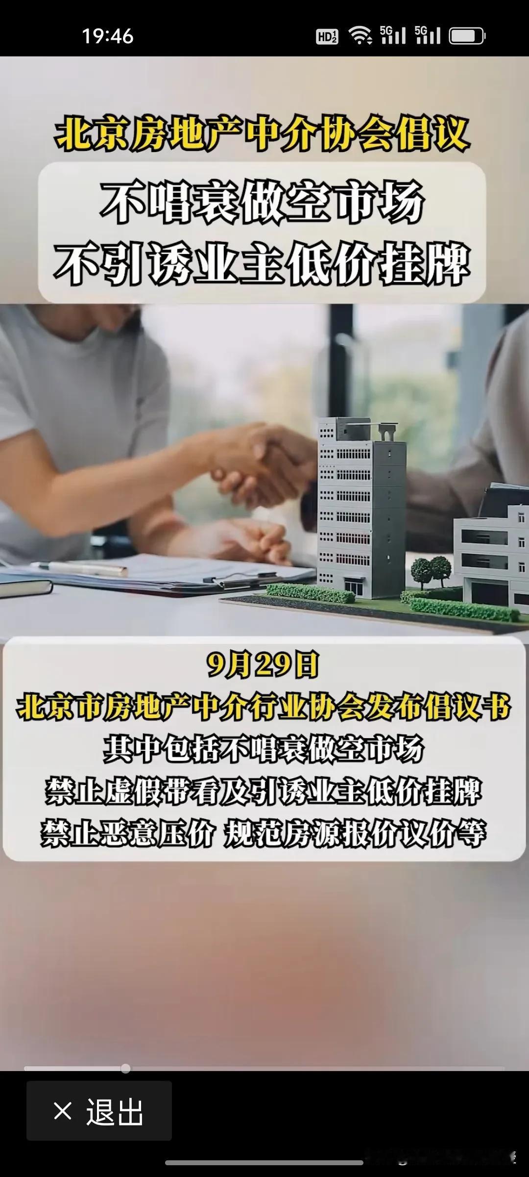 “不唱衰做空市场,不引导业主低价挂牌”。北京房地产中介协会发出倡议要规范房源报价议价。 北京上个月在70个大中城市的房价比较中竟然是领跌的,这个月安居客上北京二手房价又下跌了1.81%,这跟房地产中介为了成交让客户尽量降价有很大的关系。 包括一些中介在各大社交平台发房源视频,三环有些新房价格都已经降到了5万/平,四五环有的房源精装修都在3万/平,按照发布这些视频的中介说词,北京房价已经回到了10年前。这样广泛的传播导致真正想买房的人还不敢出手,还在等着房价会继续往下跌,谁也不想跌在半山腰接盘。这样进一步加剧了房价下行压力与市场失衡。 北京房地产中介协会及时出手发出倡议,直击中介行业乱象。在市场止跌回稳的关键阶段,这一倡议十分必要,能有效遏制虚假信息传播,对规范房地产市场的秩序极具价值。