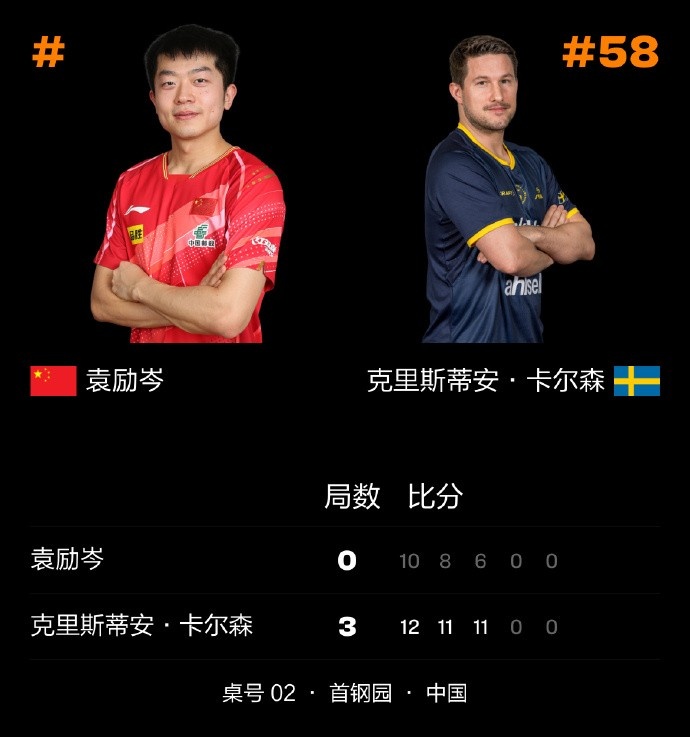 WTT中国大满贯男单1/16决赛:袁励岑0-3不敌卡尔森,无缘晋级