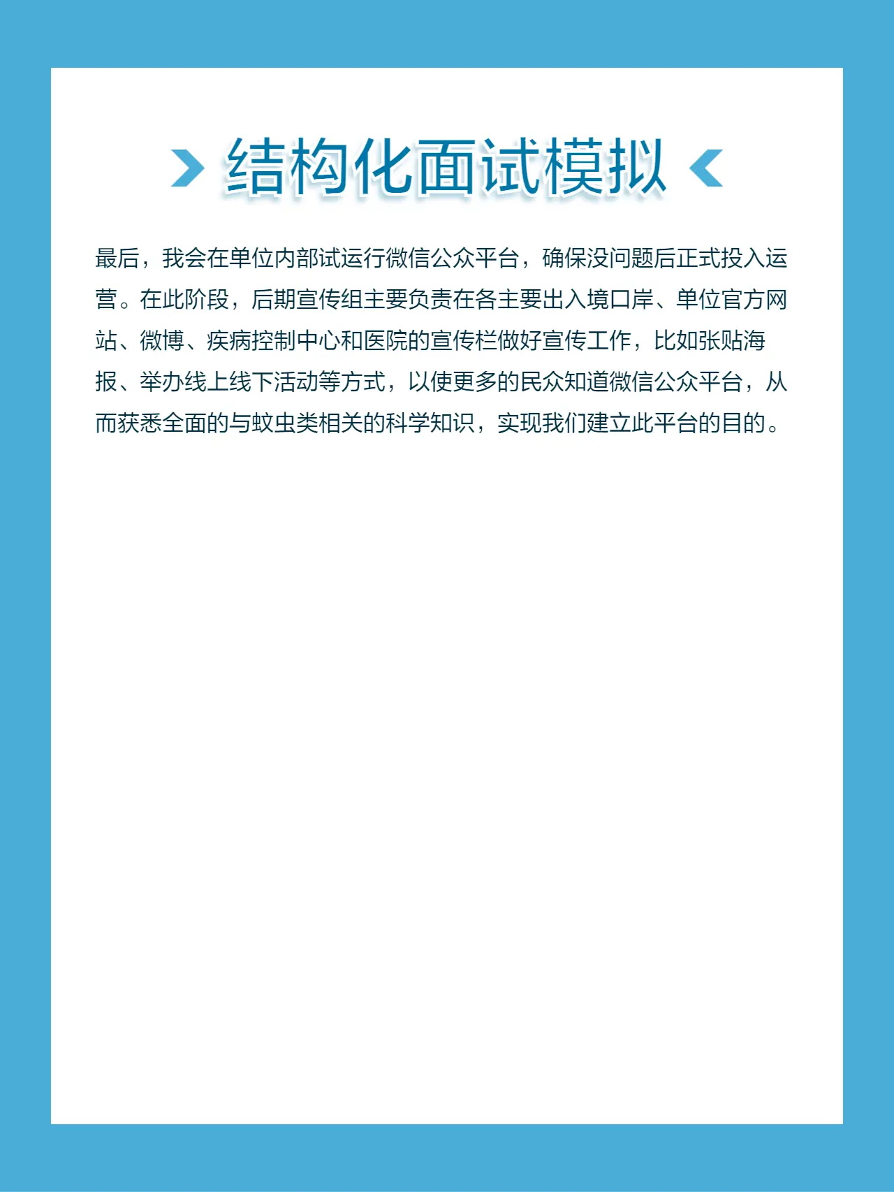 面试 结构化面试 考公面试 面试模拟 现在不少入境人员、交通工具、运输设备上可能会携带蚊虫,且种类繁多,传播途径广,埋下许时多不良隐患。针对这一问题,检验检疫局准备建立一个含图片库的微信公众平台,用于发布与蚊虫相关的图片。如果你是负责人,你将如何开展这项工作?