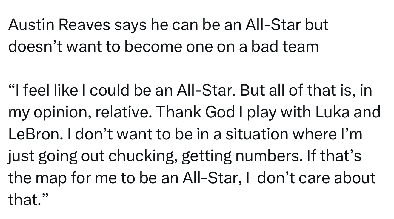 “我觉得我可以成为一名全明星。但在我看来,这一切都是相对的。感谢上帝让我能和卢卡以及勒布朗一起打球。我不想陷入那种仅仅为了数据而盲目出手的境地。如果那是我成为全明星的必经之路,我对此毫无兴趣。”