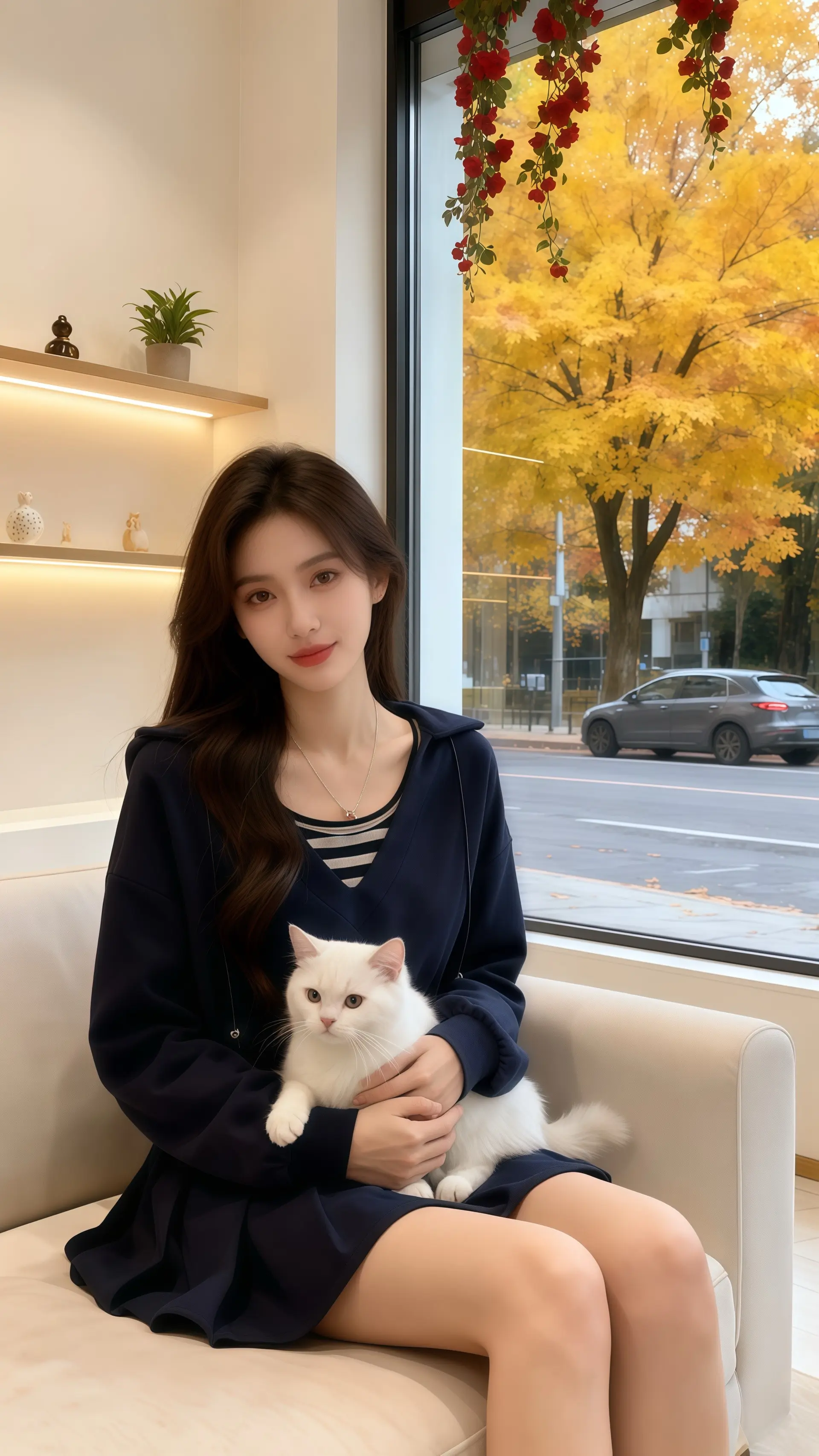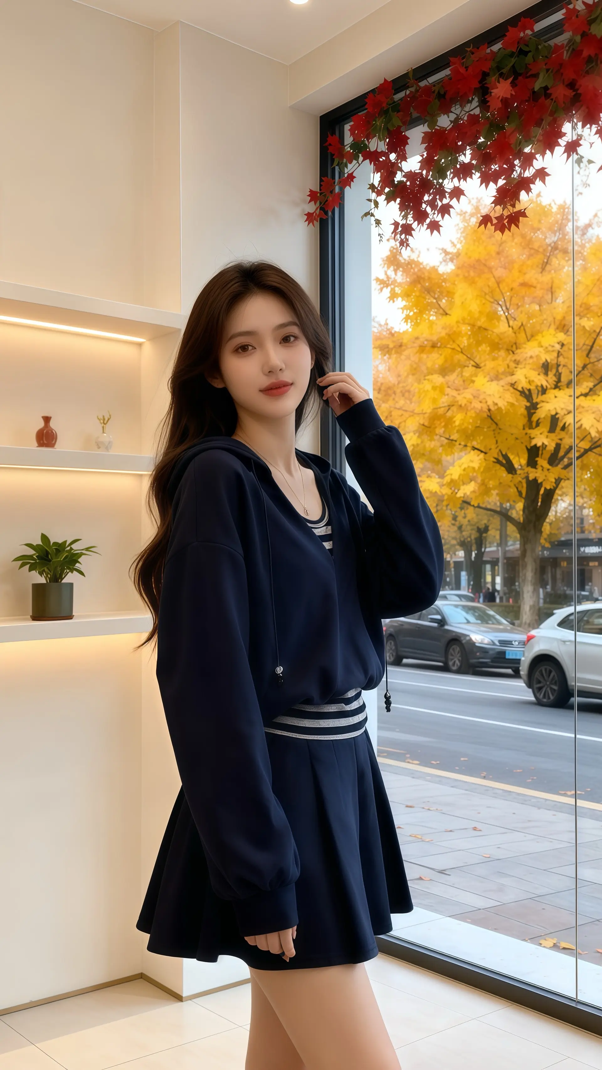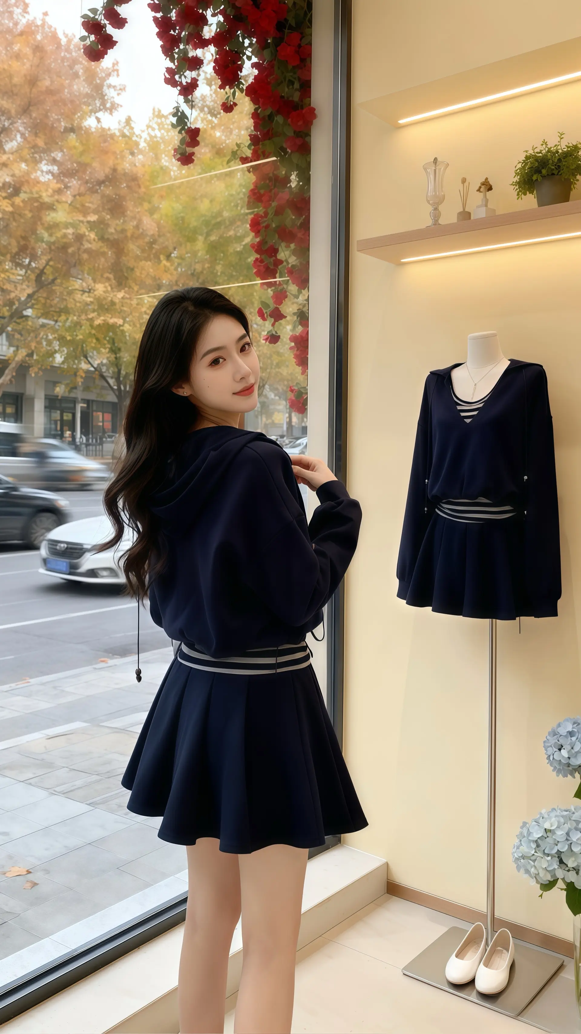 她穿着假两件时尚卫衣套装,藏青色卫衣叠搭条纹内搭,搭配A字百褶裙,在女装店落地窗前,成为秋日时尚的灵动注脚。窗外金黄枫叶簌簌铺就街道,汽车驶过带起落叶旋舞,电影感街景与店内轻奢风氛围交织。暖光架子上的绿植与小摆件点缀其间,红色花藤垂落窗边,将秋的浪漫与穿搭的精致糅合。这一身套装,把卫衣的休闲与百褶裙的甜美巧妙平衡,在秋日的诗意里,她用穿搭诉说着:时尚从不是单一风格的堆叠,而是在女装店的每一处细节里,把季节的韵味穿成专属的风格故事。