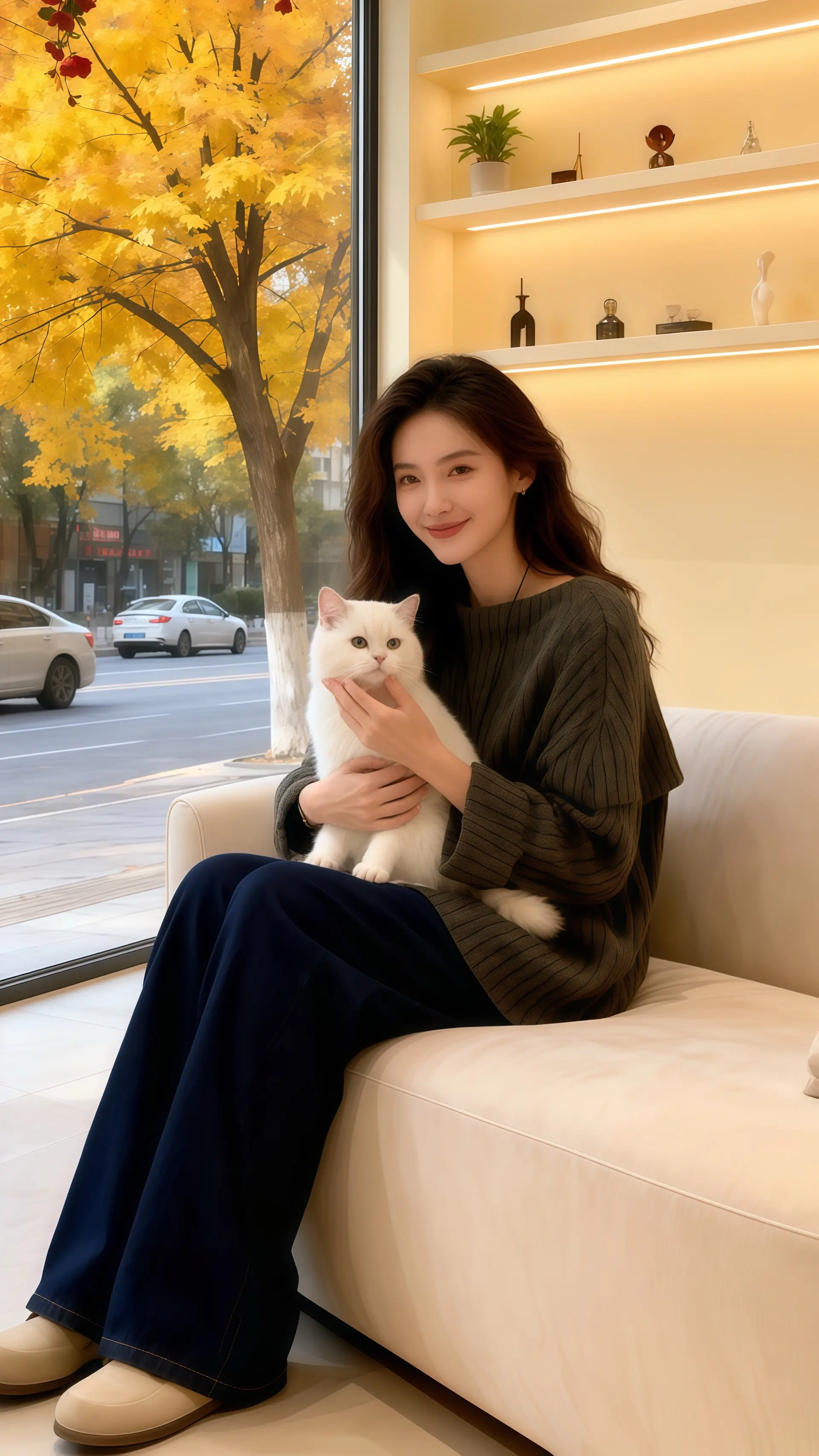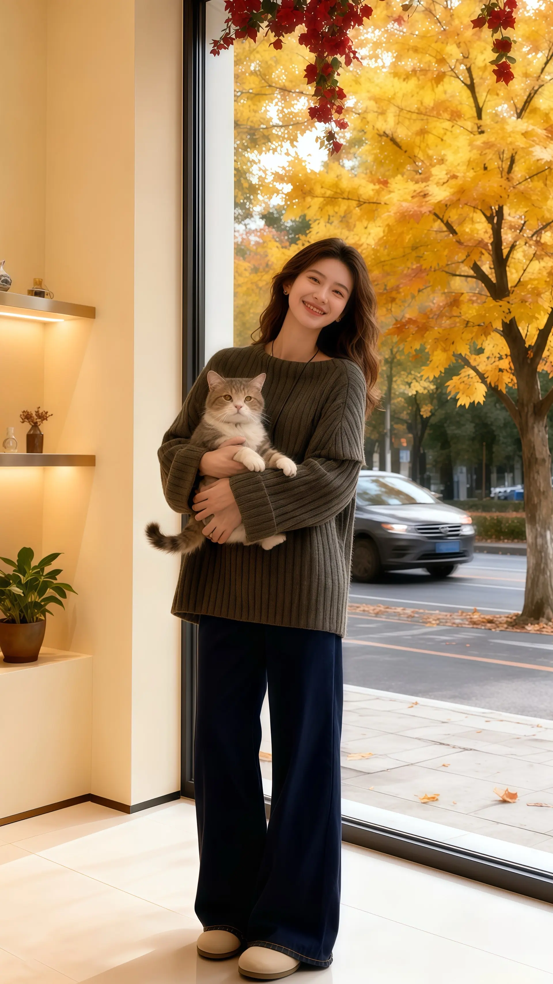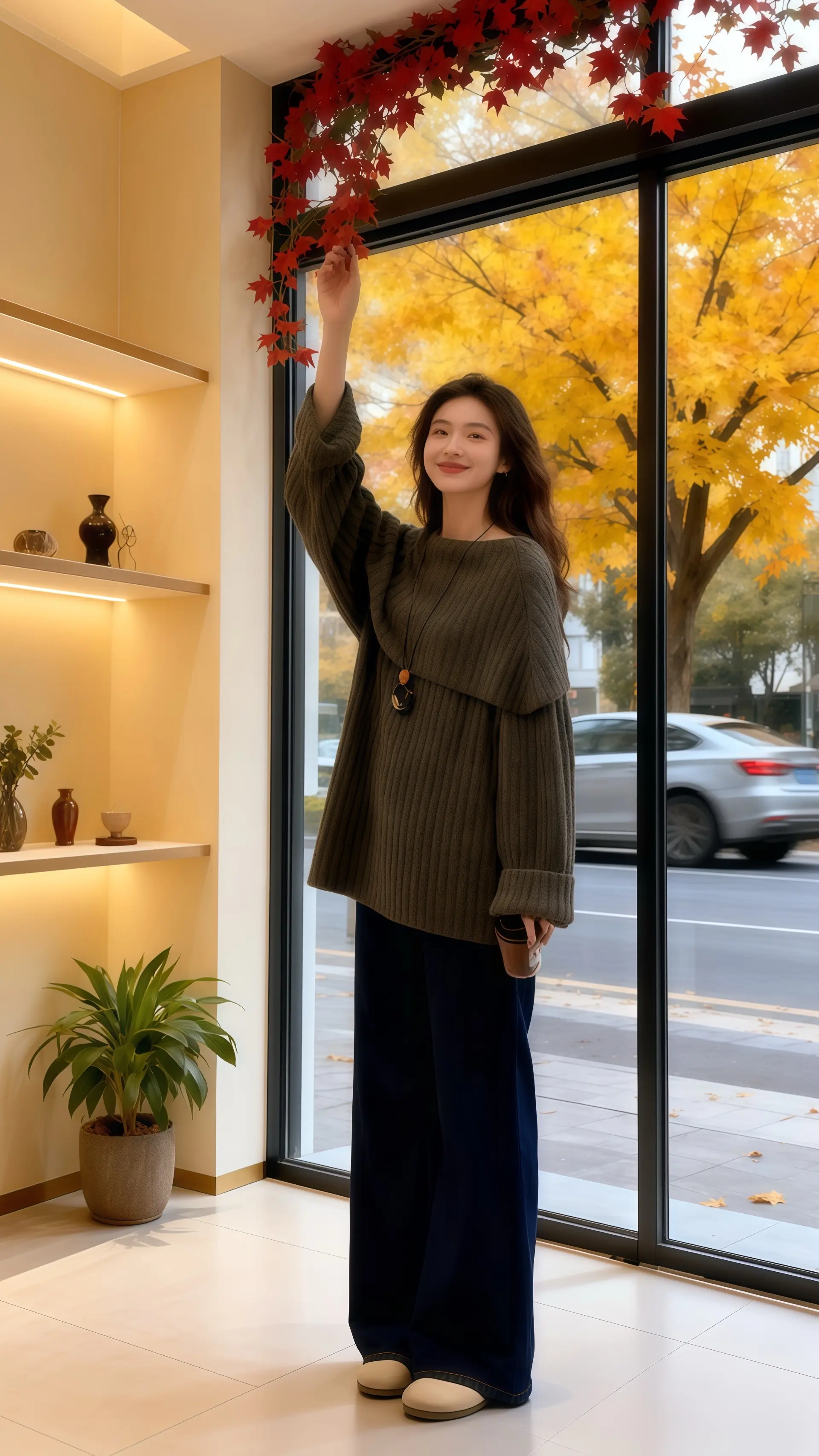 她穿着设计感复古两件套,套头针织上衣的纹理在暖光下泛着细腻质感,复古高腰牛仔裤将腰线衬得恰到好处。在这家高级感女装店,米黄色墙面上的装饰与绿植相映成趣,落地窗外的秋天正浓,金黄枫叶簌簌飘落,街道上的汽车驶过带起一阵风,把属于秋的浪漫与她的穿搭一起,酿成了独一份的时髦腔调。每一处细节都在诉说,复古与设计感的碰撞,本就是高级感的绝佳注解,而这两件套,更是将秋日的氛围感与女装店的轻奢质感,都穿在了身上。