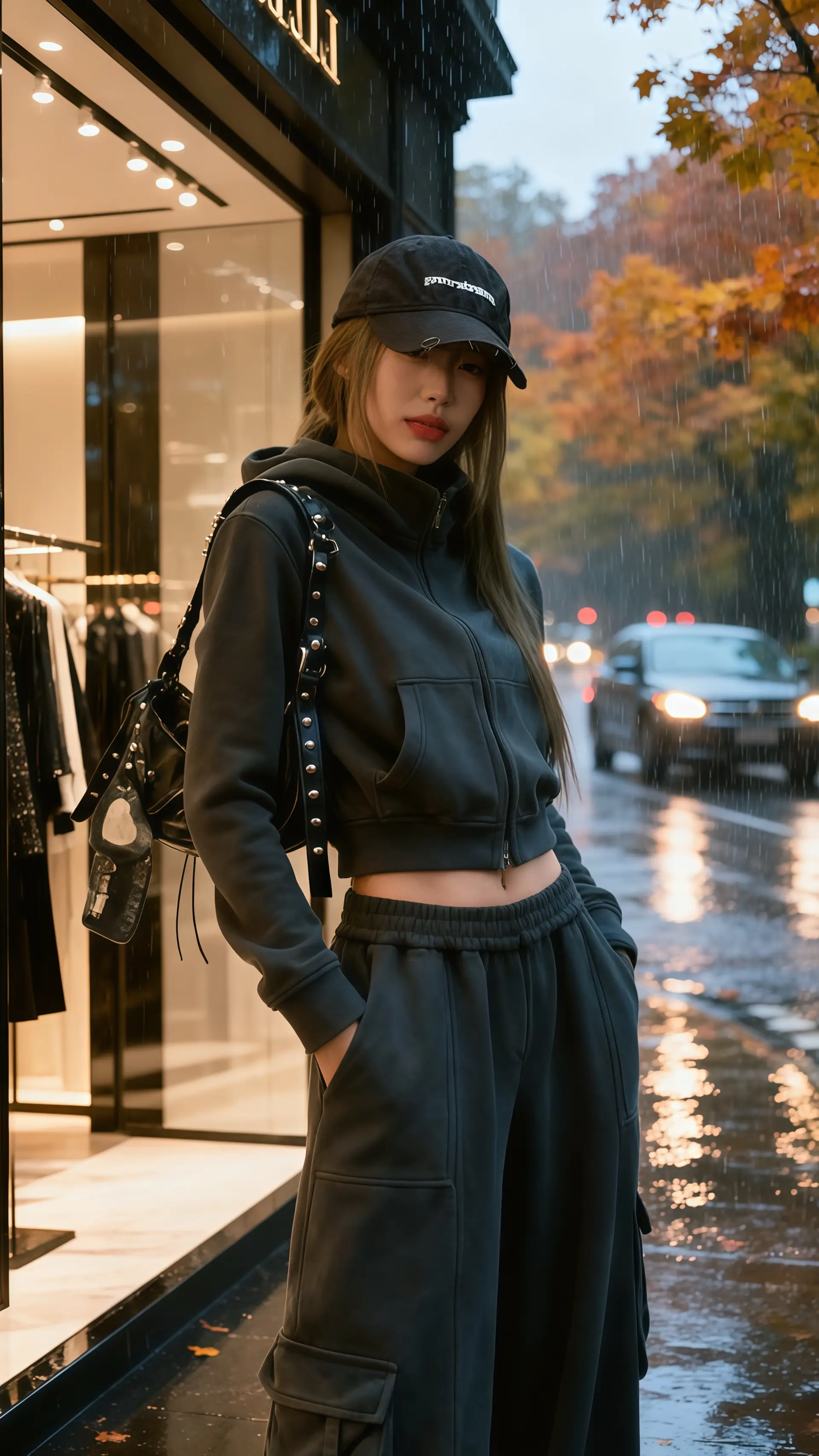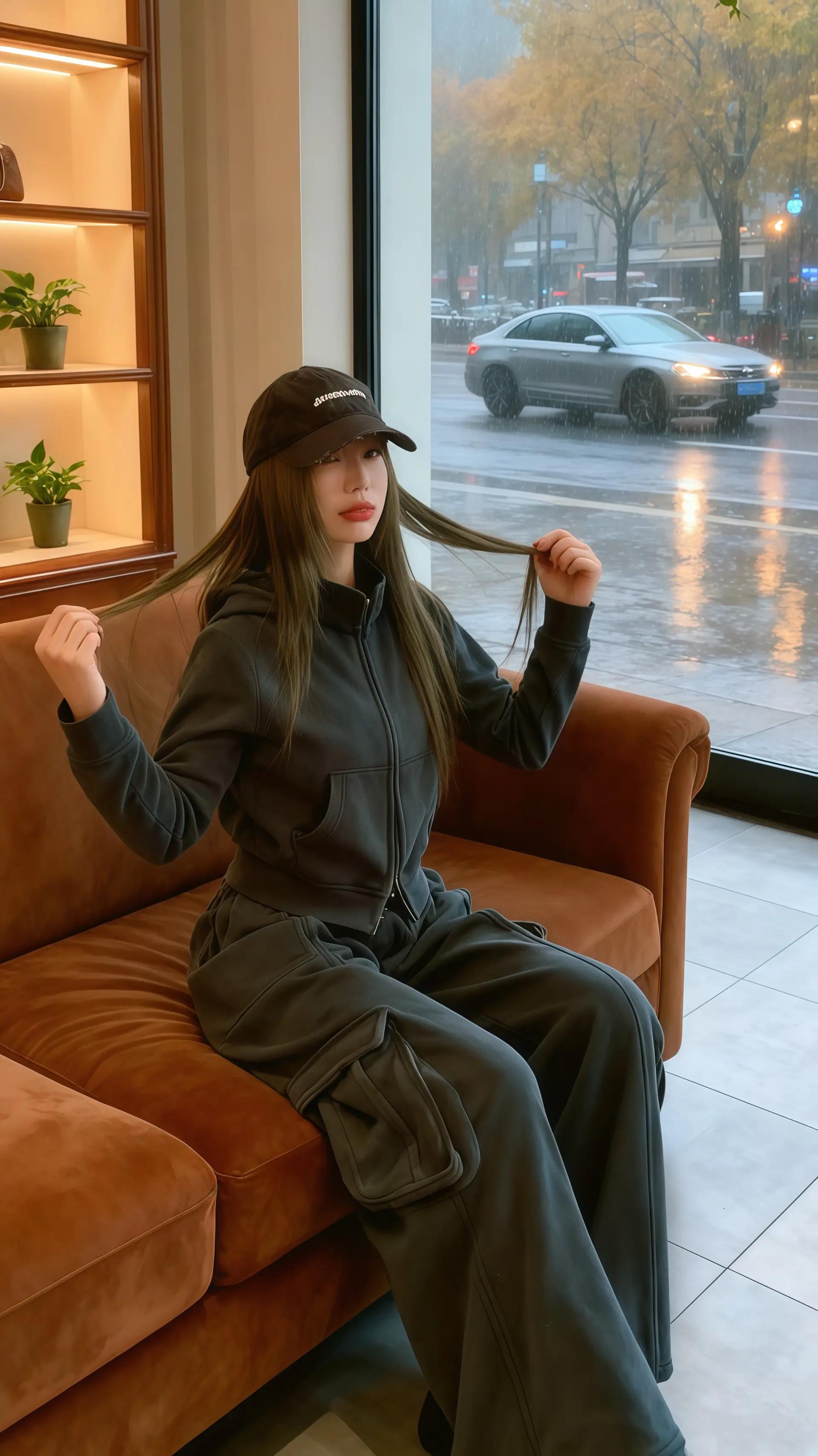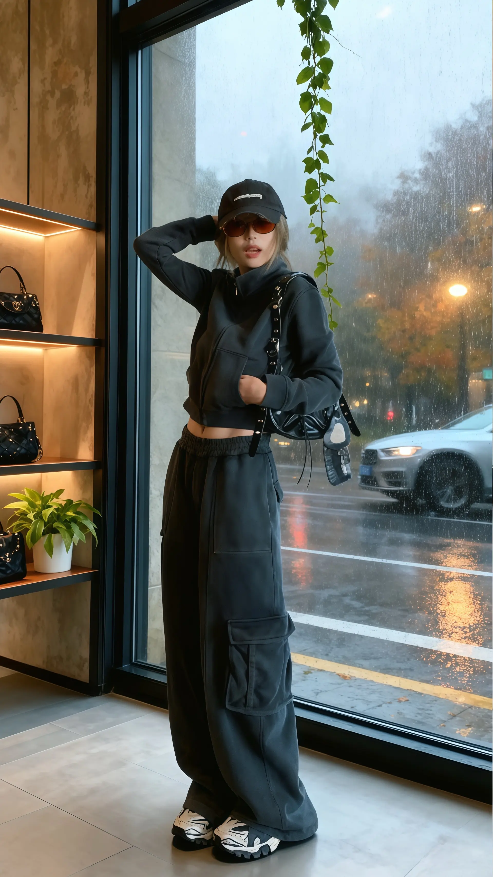 她穿着高级感时尚工装两件套,在复古女装店的落地窗前定格成一道独特风景。烟灰色的短款卫衣搭配同色系阔腿工装裤,利落剪裁勾勒出随性洒脱的轮廓,裤腿侧边的大口袋与裤脚的微喇设计,让街头感与复古风巧妙融合。戴着棕色墨镜的她,指尖轻抚过身旁灰色金渐层小猫的绒毛,慵懒的猫咪与工装的硬朗形成奇妙反差。窗外,秋日小雨朦胧了街景,暖黄路灯与湿润空气交织成电影般的质感。店内暖光架子上的包包与绿植,在浅灰地砖上投下柔和阴影。她或倚窗远眺雨幕,或坐于棕色沙发浅笑,每一个姿态都将工装的飒爽与女装店的温柔完美糅合,演绎出独属于秋日雨天的高级时尚美学。