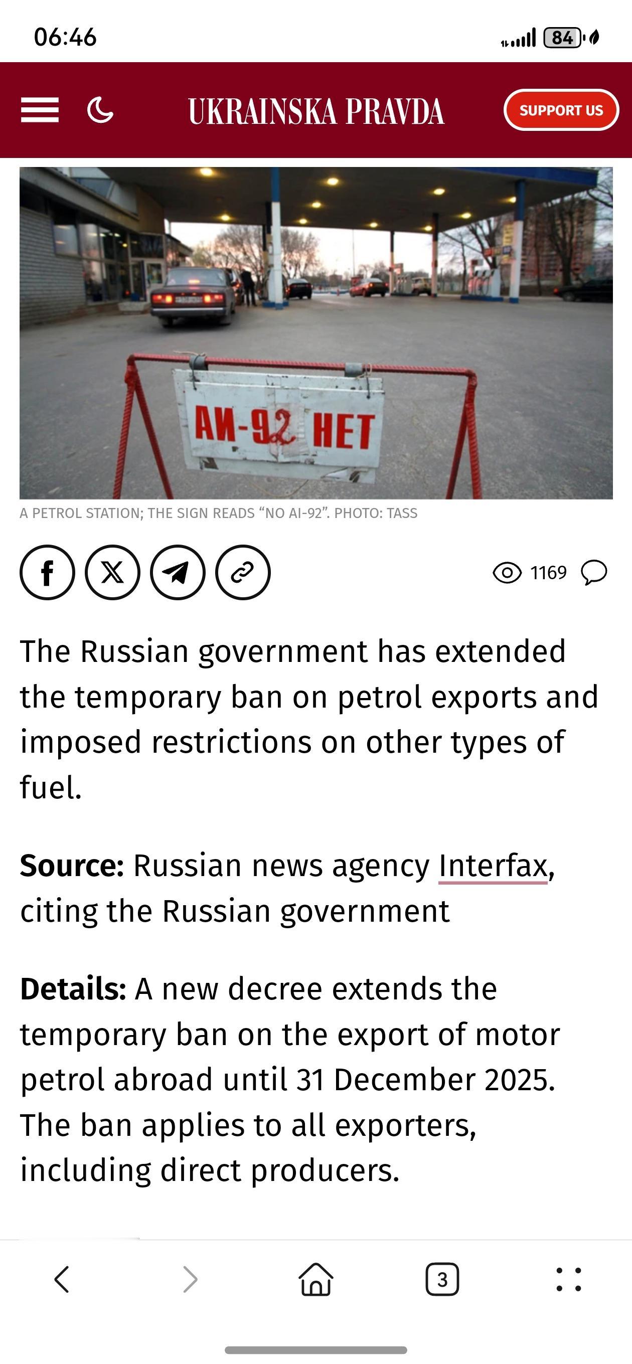 俄罗斯国际文传电讯社(Interfax)援引俄政府消息,俄罗斯政府延长汽油出口临时禁令,同时对其他类型燃料也实施限制 俄联邦政府的一项新法令将汽油出口临时禁令延长至2025年12月31日,该禁令适用于所有汽油出口商,包括直接生产商。 此前规定:生产商的汽油出口禁令原定于9月底到期,非生产商的禁令原定于10月底到期。 而另一项法令规定,柴油、船用燃料及其他粗柴油(包括通过交易所交易采购的品类)的出口禁令将实施至12月31日,但该禁令不适用于柴油生产商开展的供应业务。 今年7月底,因油价飙升,俄罗斯首次实施汽油出口禁令,并于8月延长了该禁令。 背景信息 - 乌克兰无人机袭击俄罗斯炼油厂后,俄罗斯境内20个地区及乌克兰被临时占领地区出现燃料短缺问题。 - 自9月24日起,克里米亚被占领地区的加油站已完全断供包括最贵的A100汽油在内的所有牌号汽油。 - 截至上周末,俄罗斯受供应中断影响的加油站数量较7月底减少2.6%(即减少360座),部分地区的燃料短缺问题反而愈发严重。 - 9月29日,因燃料短缺,俄罗斯占领下的克里米亚塞瓦斯托波尔市对汽油销售实施限制。俄乌战争 这是打在了大鹅的七寸上了!我看,离战争结束,不远了……