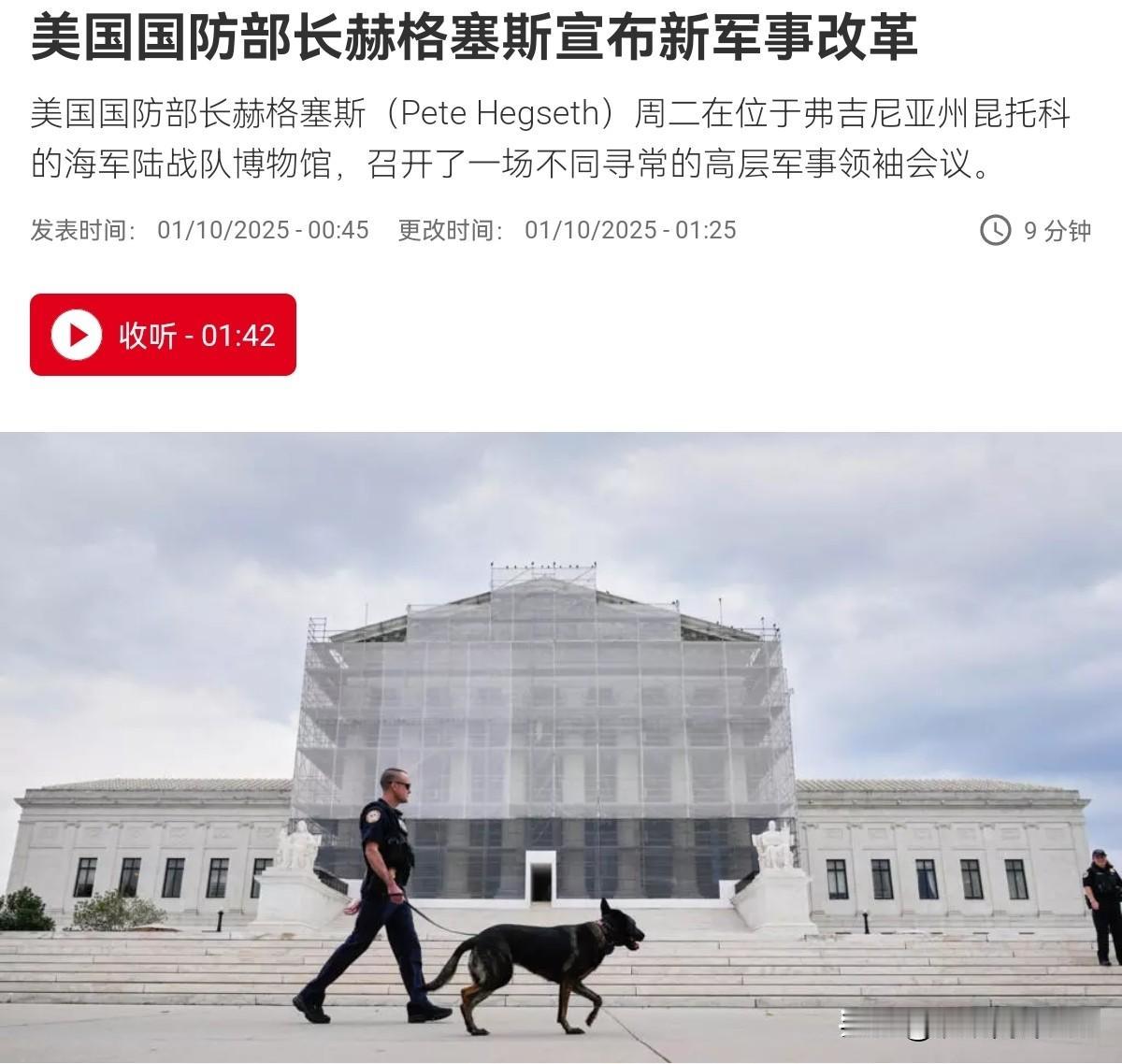 美国军队整顿开始了,美国宣布进行军事改革!10月1日,美国国防部长赫格塞斯召集数百名将领和海军上将召开了高层军事领袖会议。在会上赫格塞思表示,为了强化军事效能,国防部将推行10项新指令,终结美军内的“觉醒文化”。赫格塞思表示,他宣布将重新实施剃须要求,取消各类胡须豁免规定,要求所有军人必须保持整洁的外表。 任何无法通过体能测试、或不愿遵守仪容要求的人,应该重新选择岗位,甚至转行,新的体能标准将“性别中立”,即所有军人无论男女,都必须达到同一高标准。国防部沦为“觉醒部”。真正的有毒领导,是按照不可变的身份特征或配额来提拔,而不是靠能力。美军的使命是通过力量达致和平,而非迎合模糊、政治化的终极目标。你们的职责是杀敌、摧毁目标,而不是参与社会实验。 很显然,美国国防部长赫格塞思牵头组织如此多军方将领参加的高层军事会议,这不同寻常。赫格塞思目的为何呢?无疑,目的就是改变美国军队的精气神,重塑美军的阳刚,战斗精神。作为旁观者来看,美国军队进行这样的改革,无疑是走在正确的道路上。赫格塞思有一点说的非常的正确,那就是军队的职责就是战胜敌人、摧毁目标,而不是参与社会实验。 而要确保军队的战斗力,除了武器装备,训练,还要有严明的纪律,良好的作风。从美国内部一系列的动作来看,赫格塞思此举就是对美军作风的拨乱反正。赫格塞思无疑认为“觉醒文化”是美军精气神的乱源,影响了美军战斗力和军内风气。套用我们自己的一句话,打造一支能打胜仗的铁军,美国这是也是动真格了。