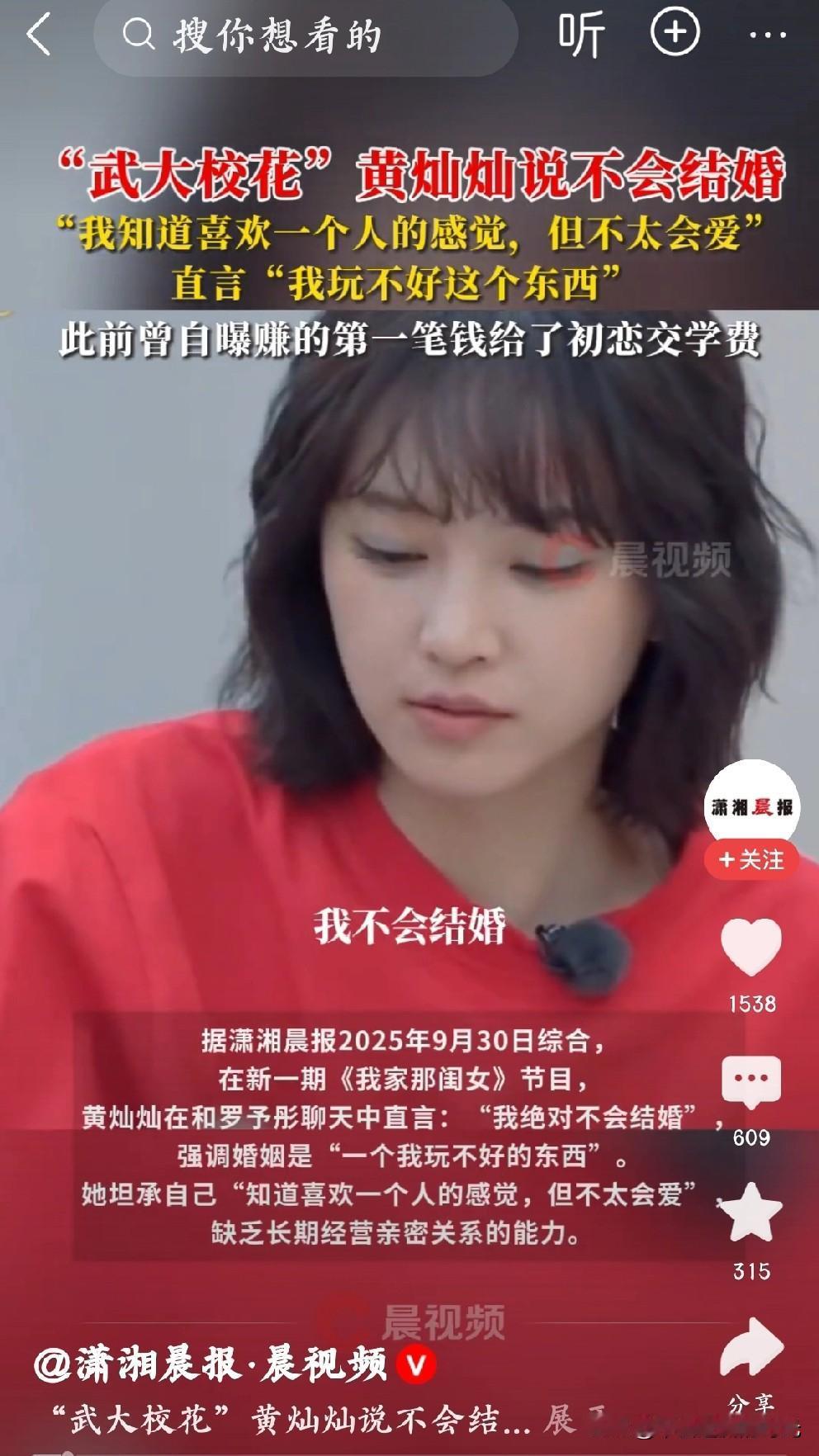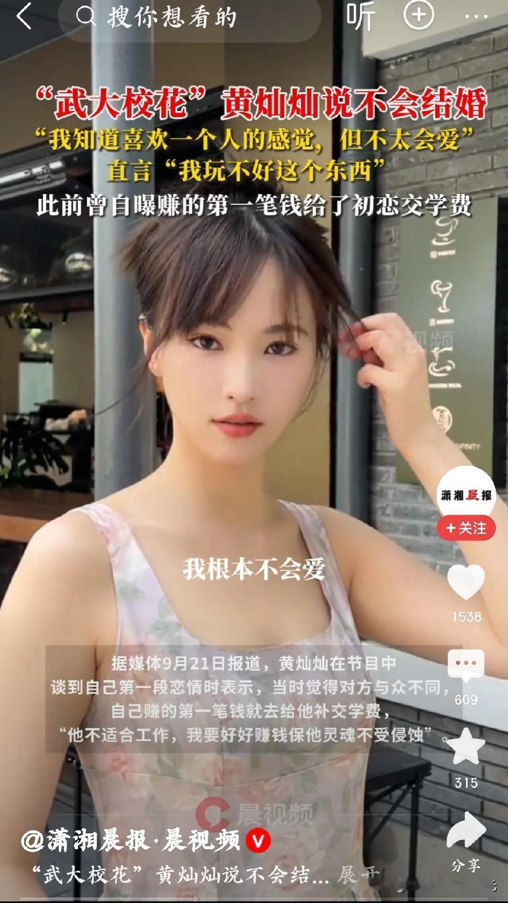 你可以说你今天不想喝咖啡、可以说今天不想早睡,也可以说这周都不想运动。 因为我们可以决定自己短时间的一些简单行为。但绝对无法在当下就把自己往后的所有决定都做了。 就比如你可以说我现在不想结婚,以后的日子还长,现在因为某些经历对某件事没有兴趣也只是当下的想法,日子还长,以后的路要怎么走都还未知。 也许人姑娘家就表达的事当下的感受,某些**就截取了这一段,然后开始…… 如何看待“武大校花”黄灿灿说不会结婚