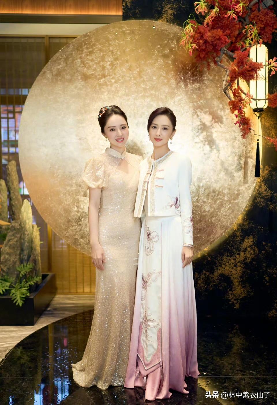 左边是董璇,1979年出生,身高170cm。 右边是佟丽娅,1983年出生,身高164.5cm。 佟丽娅作为伴娘出席董璇婚礼。 董璇身穿香槟色缎面礼服,惊艳大气。 佟丽娅身穿长袖旗袍式连衣裙,温婉动人。 二人同框,有没有觉得两人相似度很高呢?