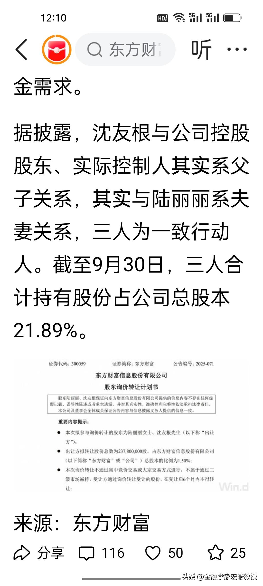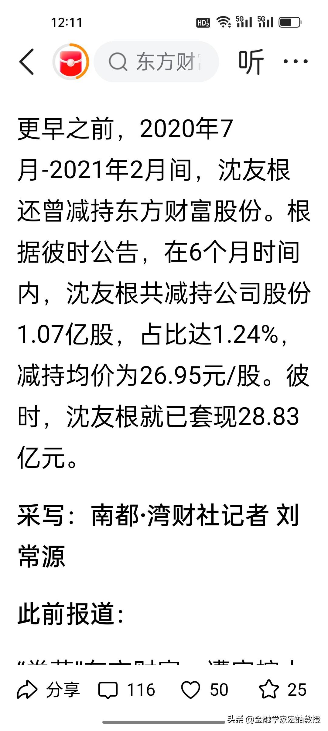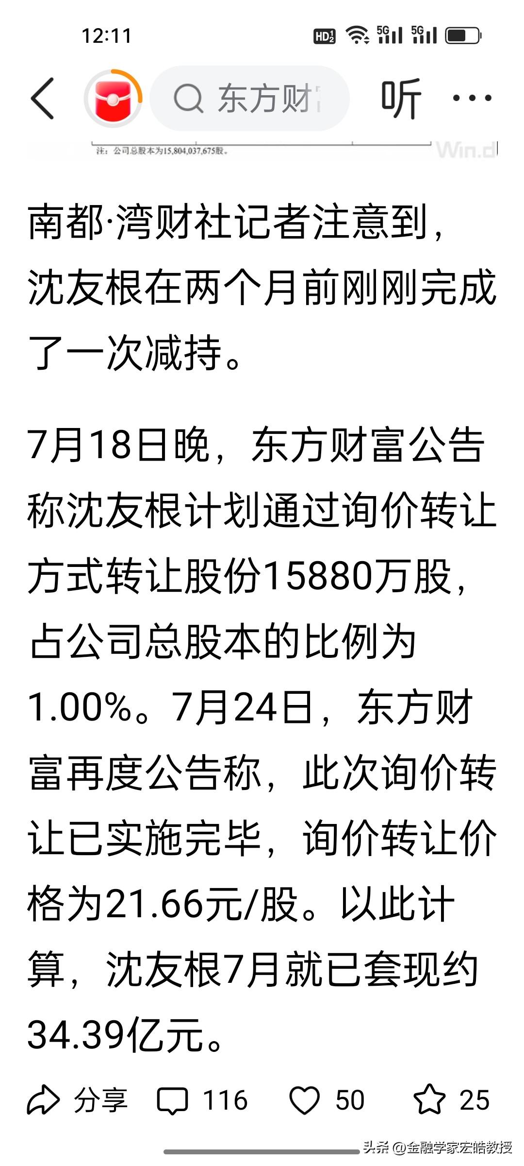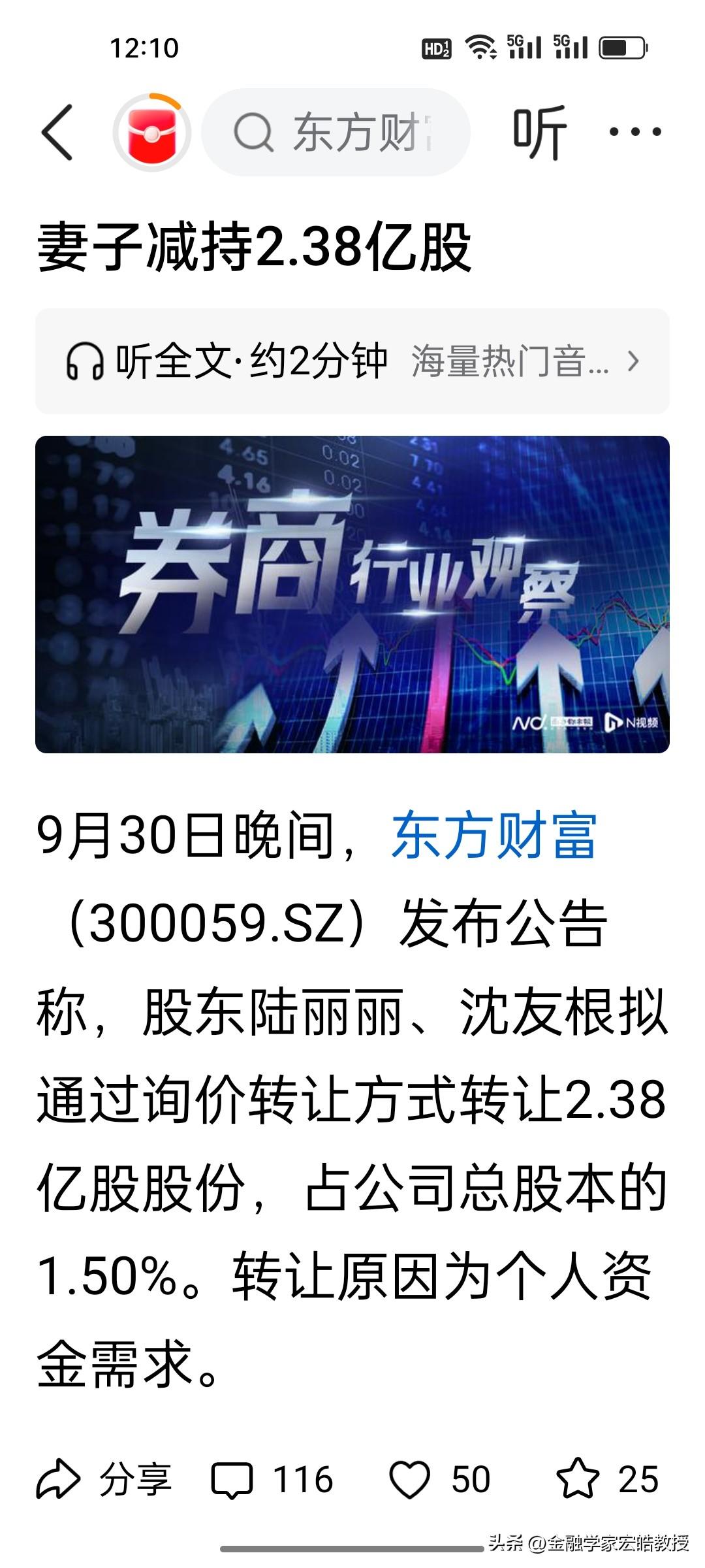 刘继鹏教授担心得事情现在正在上演。东方财富实控人亲属的这波连续减持真的有点让110万散户们猝不及防! “券茅”东方财富实控人妻子和父亲近期累计套现60亿,其父亲在今年7月份刚刚套现34.39亿,减持期间正是股价横盘整理时,减持后股价有一波上涨到30元左右。 之前在2020年7月-2021年2月期间,其父亲就减持东方财富股票28.83亿,截至9月30日,三人合计持有股份占公司总股本21.89%。这三次巨额套现就超过了120亿,这比干实业赚钱速度快多了。 对于减持理由,都是统一的“个人资金需求”,不知道这120亿是要置业还是干什么,这是国内资金需求还是国外转移不得而知,但是这一波连续大额减持在A股市场确实罕见,这让东方财富110万户散户慌了神,这个国庆过得忐忑不安了,大家不禁会问,9号开盘后会不会让所有中小散户们买单?