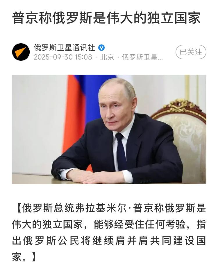 普京称俄罗斯是伟大的独立国家,能够经受住任何考验,俄罗斯公民将继续肩并肩共同建设