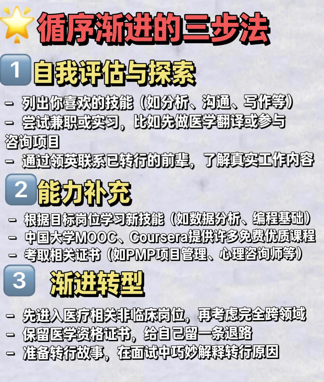 - 尝试兼职或实习,比如先做医学翻译或参与咨询项目