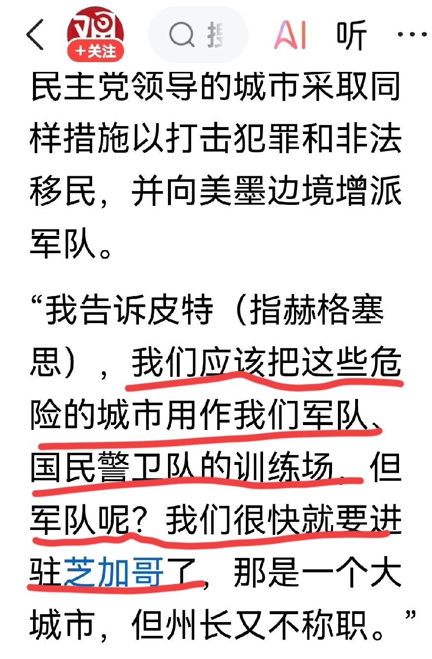 特朗普说;一些危险城市险,将成为美国军队的练兵场。 9月30号在美国弗吉尼亚州召开的美高级将领会议上,美总统特朗普进行了讲话,特朗普说,对美国的一些“危险城市”,将成为我们军队的练兵场,我们的军队和国民警卫队将进驻这样的城市进行军事训练,特朗普还点名美国的军队将进驻不听话的城市“芝加哥”。 特朗普可能不是一时激动去瞎说,不听话的危险城市变成练兵场可能已经蓄谋已久,其目的就是打击他的死对头。而这样的事就美国不久前就发生过,美国移民局在加州抓捕非法移民时,特朗普就调动了美海军陆战队数百人去加州助战。 特朗普的言行遭到对手的强烈反对,美国有没有可能会发生内战呢?(信息来自观察者网)