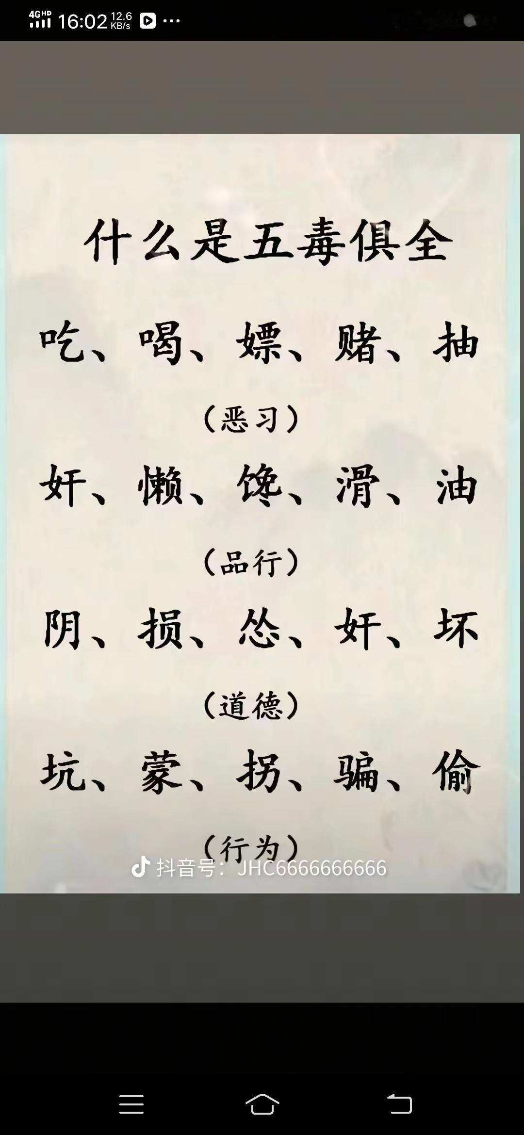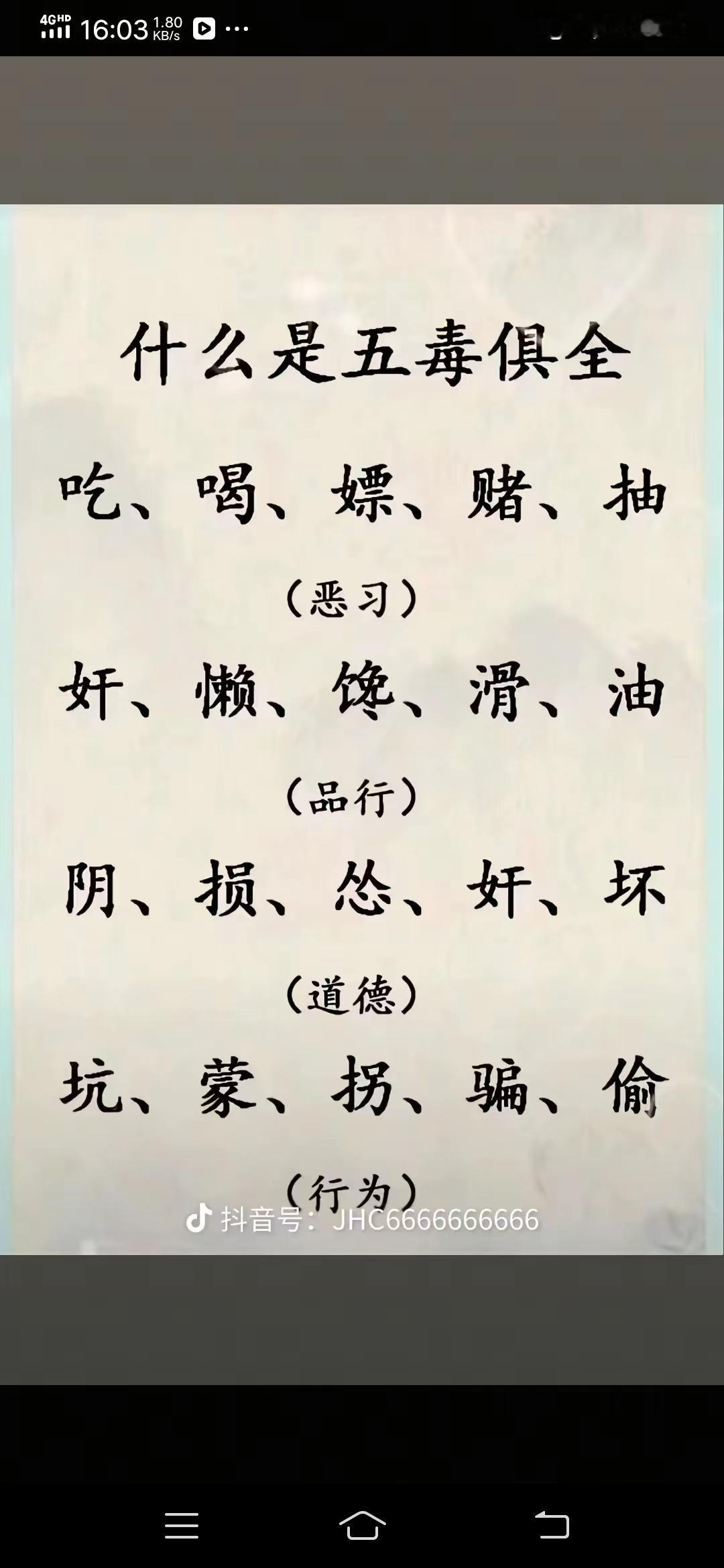 这才是真正的“五毒俱全″通常人们所说的“五毒”就是:吃喝嫖赌抽,但真正的“五毒俱全"还包括:四行和二十个方面。 四行:恶习、品行、德行、行为。 二十个方面是:吃 喝 嫖 赌 抽,奸 懒 馋 滑 油,阴 损 怂 赖 坏,坑 蒙 拐 骗 偷。