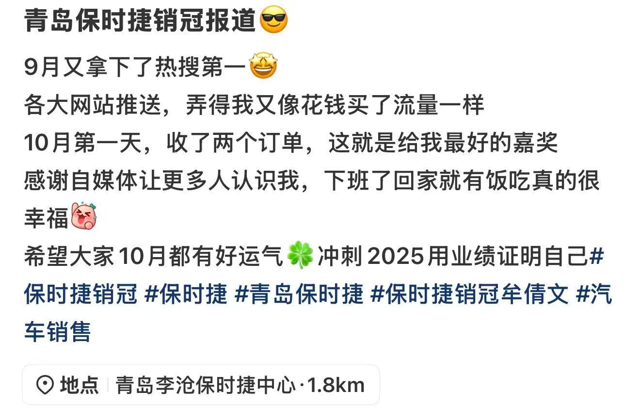 青岛保时捷女销售回应9月再夺销冠青岛保时捷销售国庆首日开单2台 10月1日,山东青岛,青岛保时捷女销售牟倩文在社交平台发文回应9月再夺销冠,“9月又拿下了热搜第一🤩各大网站推送,弄得我又像花钱买了流量一样 10月第一天,收了两个订单,这就是给我最好的嘉奖 感谢自媒体让更多人认识我,下班了回家就有饭吃真的很幸福 希望大家10月都有好运气🍀冲刺2025用业绩证明自己”青岛[地点]
