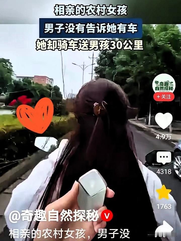 这农村相亲的剧情也太甜了吧! 男子没提自己有车,姑娘却直接 骑车30公里送他回家,这操作 简直让人直呼“内行”! 有网友调侃说“给你露腰机会,你却在炫车钥匙”, 可这姑娘压根就没把车当回事儿,眼里只有眼前这个小伙子。 说实话,现在这社会,能碰到不图物质、只看人的姑娘太难得了。 这姑娘30公里的骑行,不仅仅是送行,更像是在说:“我看上的是你这个人,不是你的车。” 这种纯粹的感情,简直就是“孤品”级别的存在。 我觉得啊,小伙子要是碰到这样的姑娘,可得赶紧抓住了,别等错过了才后悔。 毕竟,能陪你一起骑车走过30公里的人,未来也一定能陪你走过人生的风风雨雨。 大家说是不是?这样的姑娘,你遇到了会珍惜吗? 小伙相亲 相亲习俗 农村女人相亲
