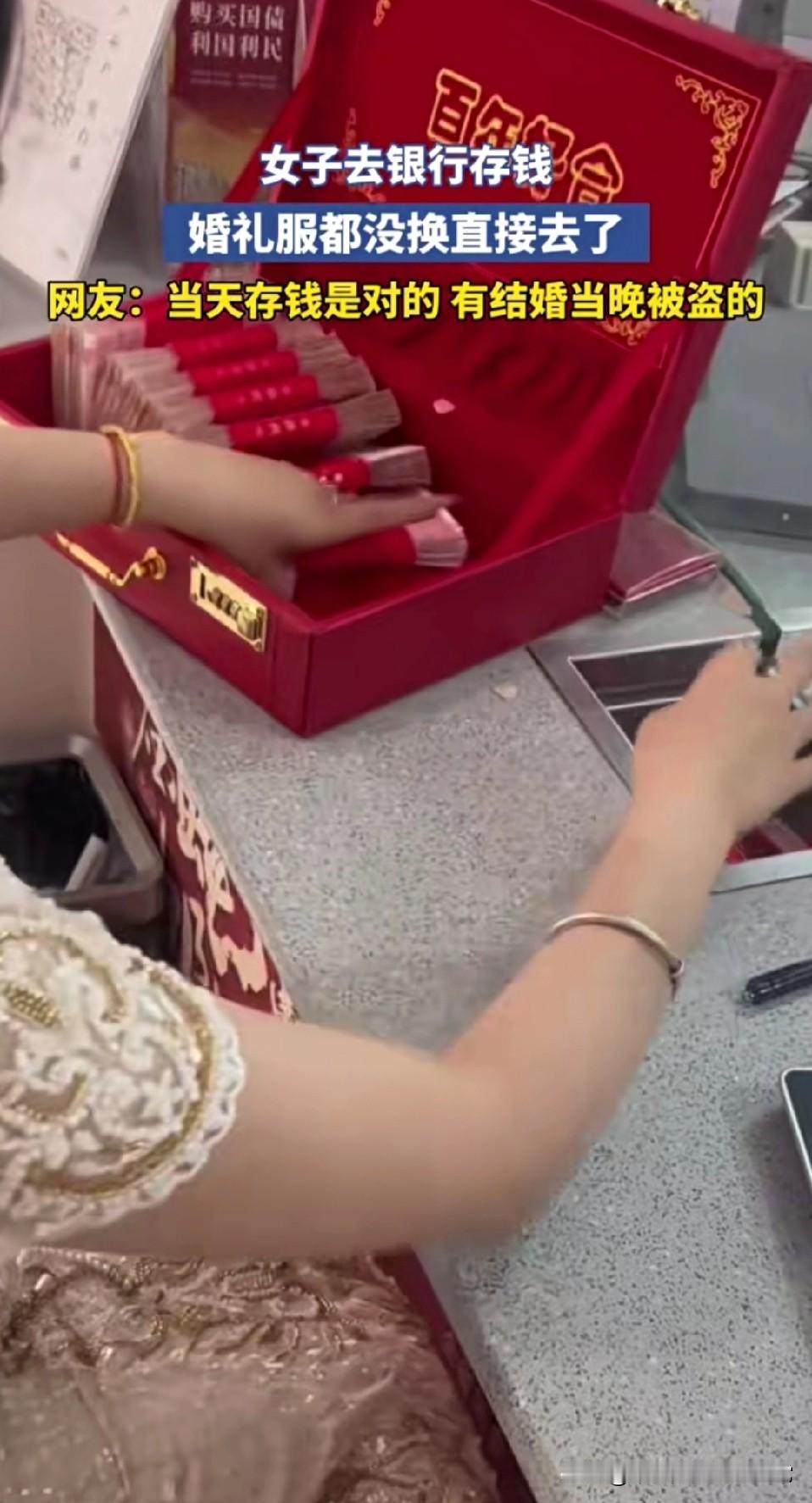 新娘穿婚纱直奔银行存钱! 安徽一新娘婚礼服都没换,直接抱着一箱子红包冲进银行存钱!这画面太绝了,网友直呼“清醒到极致”。毕竟有太多结婚当晚被盗的先例,新娘这波操作堪称“婚后理财第一课”。 有人夸她“人间清醒,把安全感牢牢握在手里”,也有人调侃“这婚结的,银行成了第二现场”。婚礼的浪漫还没散,存钱的务实就接上了,这反差感直接拉满。 可你想过吗?结婚当天就急着存钱,是太现实还是太明智?有人觉得婚姻需要信任,也有人觉得钱存银行才踏实。你觉得,这位新娘的操作,是该赞还是该议?