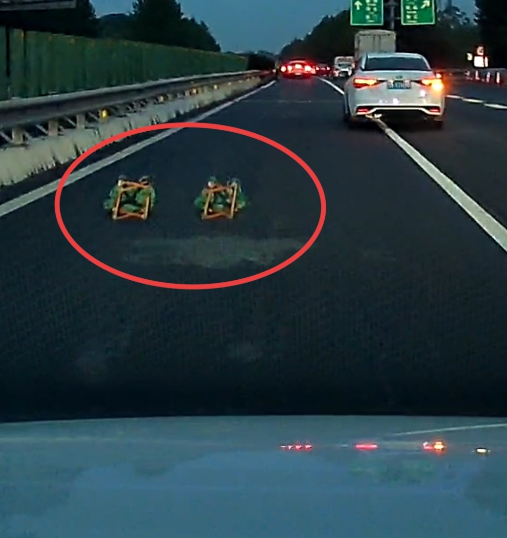 2️⃣本应该放三角牌的地方,放了两坨铁架类似的东西,无任何反光标识,这也太吓人了…[跪了][跪了][跪了]