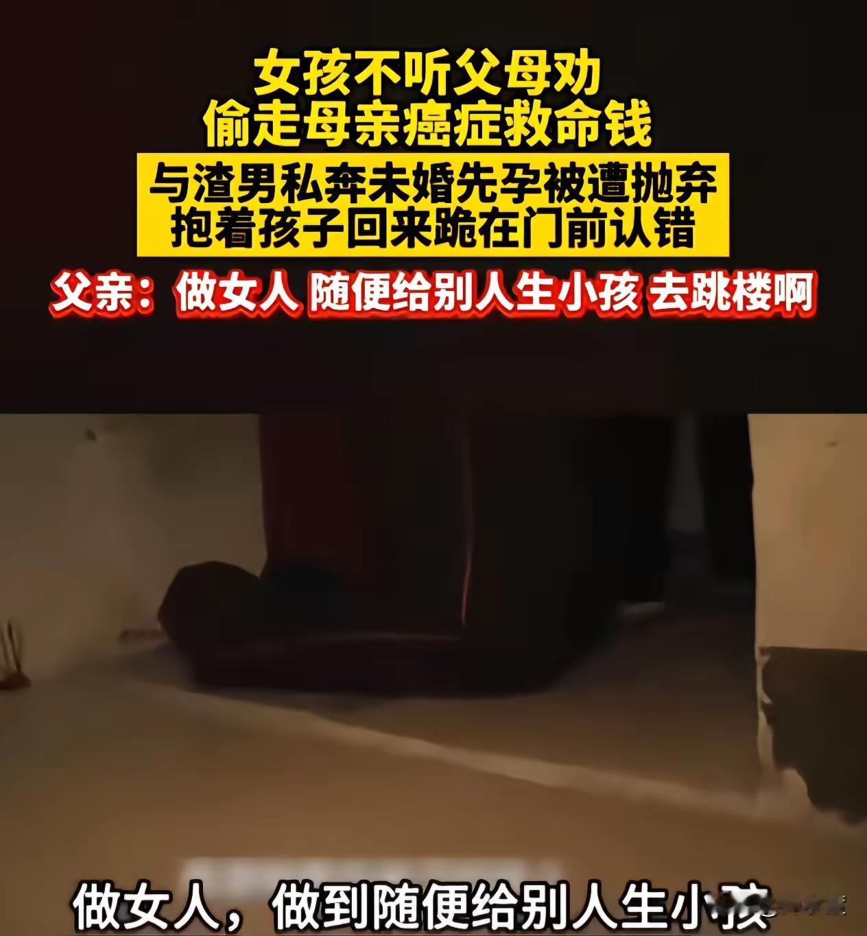 到底要不要原谅? 一女孩不听父母劝, 偷走母亲癌症救命钱, 与渣男私奔, 未婚先孕被遭抛弃。 抱着孩子回来, 跪在门前认错。 有网友表示: 她这样的不是仅没头脑,还阴狠歹毒,母亲的救命钱也偷,相当于弑母。 这种女孩子就是窝里横讨债精吸血鬼,专门压榨剥削父母倒贴外人。从她偷钱私奔的那一刻起,父母就没有这个孩子了,坚决不认! 私奔最多也就是以后和父母关系不好,可是偷走母亲救命的钱倒贴男人,罪无可恕,绝不相认,立马赶走。 如果偷钱私奔没什么,被渣生子也还能接受,但偷母亲救命钱那性质就不一样了,不可能原谅,死不足惜!只是被带到世界的娃娃造孽了。 对此,大家觉得女孩该不该原谅呢?