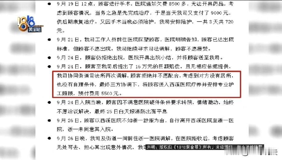 离了个大谱!浙江杭州,一女子在商场滑倒,左腿受伤,做了手术,商场垫付医疗金1.9万,谁知女子嫌每天40元的普通病房不好,私自改成了每天1000元的高档单间,医疗费很快花完,还欠医院8000块钱,商场不愿缴纳增项费用,女子被迫出院,她要去做康复,要求商场赔她16万,商场虽然不予认可,但看她居无定所,还是把她送到另一家医院,给她请了专业护工照料,女子嫌这家医院条件不好,她又私自出院,跑回原来的医院,原医院拒收,商场怕她出意外,给她300块钱,让她去住酒店,女子没完,商场没辙了,借给女子8000元诉讼费: 你去法院告我们吧! 轩女士居无定所,靠打零工挣钱,她当过工人,做过后厨帮工,又去做服务员,每月两三千元工资,养活自己没啥问题。 9月14号这天,她闲来无事,到一家大型商场闲逛,她在商场通道处正往前走,没有注意到地板上有一点水渍。 她先迈出的右脚,结果脚下打滑,一个劈叉滑了出去,劈叉又劈不下去,左腿折叠,膝关节碰到了地面。 轩女士疼的钻心,瞬间头上冒出了冷汗,左膝盖眼看红肿起来,轩女士疼的大喊起来。 因为是在商场摔伤,工作人员立刻将她送往了医院,医生诊断,左腿髌骨脱位,韧带损伤,需要做手术,轩女士没钱,还借了同事1000多元。 商场给她垫付了19000元医疗费,9月19日下午1点,医生为她做了手术。 手术做完,轩女士左腿被固定住,她坐上轮椅,暂时不能活动。 9月24号这天,19000元医疗费已经用完,还欠医院8000多元,轩女士要求商场支付欠款,可商场拒付,轩女士被迫出院。 原来,轩女士做完手术之后,原本安排住进普通病房,每晚40元。 可是她嫌病房条件不好,反正是商场给自己掏钱,她私自将病房升级为每晚1000元的高档单间病房,这才超出了商场垫付的医疗费。 可是商场不认可这笔增项,凭啥你要私自升级病房?最起码也得给商场打声招呼,你自己一声不吭就住1000元一天的病房? 轩女士被迫住院,被医院送回到了商场,轩女士不依不饶,要求商场赔偿她16万。 因为她还要做后续的康复,每月需要1到2万。 可商场认为,要钱得有医嘱凭证,不可能由你随口就来,因此商场拒绝支付,对轩女士的要求不能满足。 可是轩女士居无定所,她靠打零工维持生活,她进过工厂,当过工人,又在后厨帮工,还做过服务员,就连住进医院,还借了同事1000元。 商场看她没地方去,总不能把她扔在商场里不管,于是给她联系到另一家医院,给她请了专业护工照料,预付了5500元费用,供轩女士疗养。 可万万没有想到,9月24日当晚,轩女士住进这家医院,她嫌这家医院条件不好,她情绪激动,和护工发生矛盾,也不同意协商解决。 9月26号,轩女士自行出院了,她又回到之前给她做手术的医院,可医院一看是她,拒绝接收她住院。 商场接到消息,立刻派工作人员,又联系了街道工作人员一起来到了原来的医院。 商场一看轩女士这个架势,现在的医院她不肯住,原来的医院又不肯接收,她孤身一人,又没有住处,商场没了办法,总不能让她流落街头。 商场怕她又出意外,赶紧给了她300块钱,暂时让她先住进了酒店。 轩女士找来记者,要求商场支付给她16万元费用以及结医院的8000元欠费。 商场做出回应,将事件的经过讲述了一遍,商场表示,后续如有相应医嘱,我司不会逃避责任,会继续配合顾客治疗。 轩女士向记者承认,她私自更换病房,确实没有通知医院,而她提出的16万元康复费用,是按照私立康复中心的费用计算。 她还声称,她26号离开第2家医院是因为她有事情,她还和护工产生了误会。 如果商场能够支付医院的欠费和之后的疗养费用,她可以不要求其他的赔偿费。 之后,记者得知,当地司法所介入调解,双方协商的结果是: 商场方面垫付医院的医疗费用,另外,商场再借给她8000元诉讼费,让她用法律解决问题。 换句话说,我借给你8000诉讼费,你去法院告我吧! 《民法典》第1198条规定: 宾馆、商场、银行、车站、机场、体育场馆、娱乐场所等经营场所、公共场所的经营者、管理者或者群众活动的组织者,未尽到安全保障义务,造成他人损害的,应当承担侵权责任。 在该事件中,商场通道地板上有水渍,商场未能及时清理或设置警示标志,导致轩女士滑倒受伤,商场未尽到安全保障义务,应当对轩女士的损害承担侵权责任。 《民法典》第1173条规定: 被侵权人对同一损害的发生或者扩大有过错的,可以减轻侵权人的责任。 轩女士在商场行走时,没有注意到地面有水渍,自身也存在一定的疏忽,对损害的发生有过错,可以减轻商场的责任。 此外,轩女士未经商场同意,私自将普通病房升级为高档单间,导致医疗费超出商场垫付范围,对于超出部分的费用,轩女士自身应承担主要责任。 目前,商场表示,借给轩女士8000元诉讼费,后续使用法律途径解决问题。 关注@王哥说法