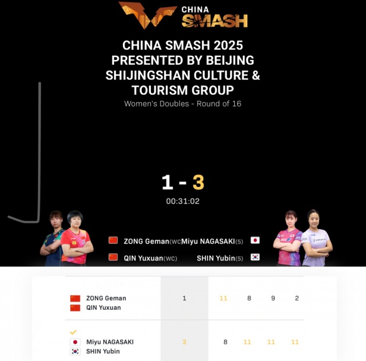 直播吧10月1日讯2025WTT中国大满贯女双1/8决赛,中国组合纵歌曼/覃予萱1-3不敌日韩跨国组合长崎美柚/申裕斌,无缘下一轮。