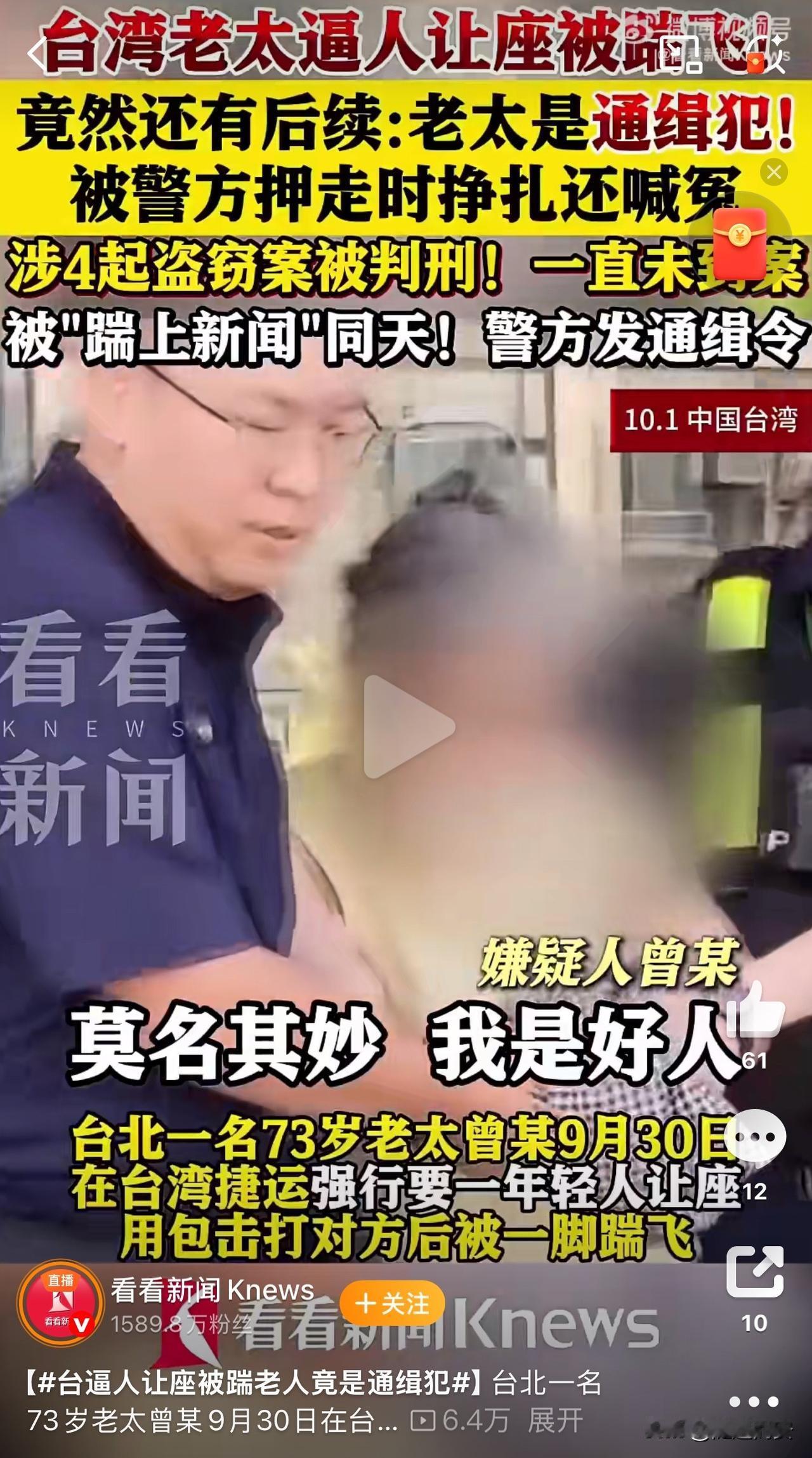 这真是不可思议的大反转!近日,台湾一老妇和年轻小伙因博爱座发生争执的视频引发热议,没想到这名老妇还有另一层身份。 事情发生在9月29日的台北捷运淡水信义线上,73岁曾姓老妇要求坐在“优先席”(原博爱座)的年轻乘客让座,声称需挂包。 从视频上看车厢内空位充足,小伙想都没想直接拒绝,老妇见多次被拒后,竟然用手提袋及雨伞多次击打对方。 年轻小伙也没惯着她,直接起身猛踹,老妇跌至对面空座,好了,这下老妇有座位了。 现场视频显示,老妇惊呼:“原来他是男的!太可怕了!”并扬言报警,但最终未追究离开。 原以为这件事到此结束了,没想到居然还有后续,揭开了老妇的另一层身份。 据相关报道,这名老妇涉及4起盗窃案,被判刑了55天,但是她却一直没到案执行,9月30日被帽子叔叔正式通缉。 令人讽刺的是,刚发布通缉令不久,她就因为让座冲突直接登上了新闻头条,对帽子叔叔来讲,这真是“踏破铁鞋无觅处,得来全不费工夫”! 信息来源:看看新闻