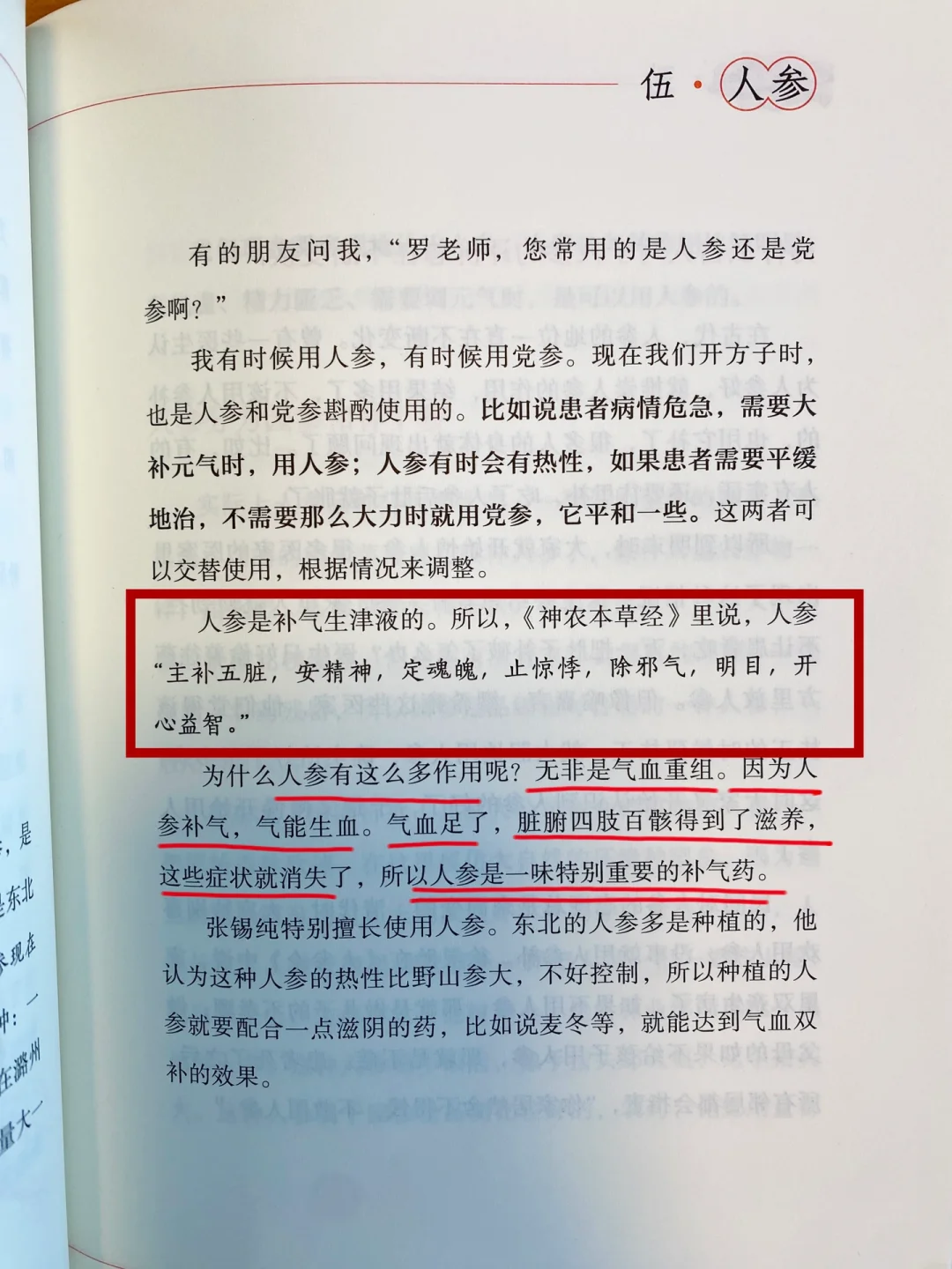 [向右R][向右R]罗大伦老师在《养命之方》书中提到人参是补气生津液的。人参能补气,气能生血。气血足了,身体得到滋养,很多症状就消失了。但人参的热性很大,需要配合一点滋阴的药。