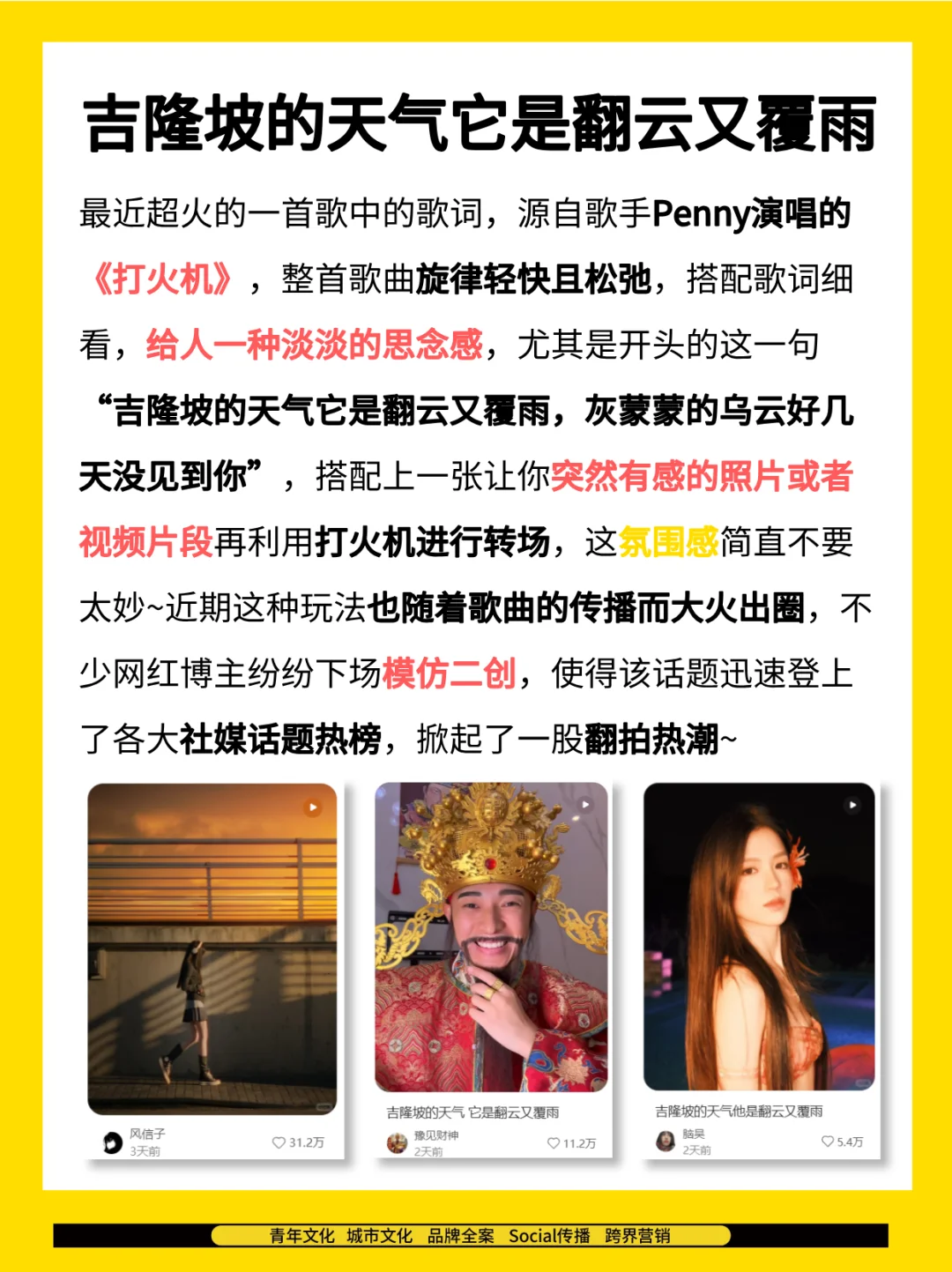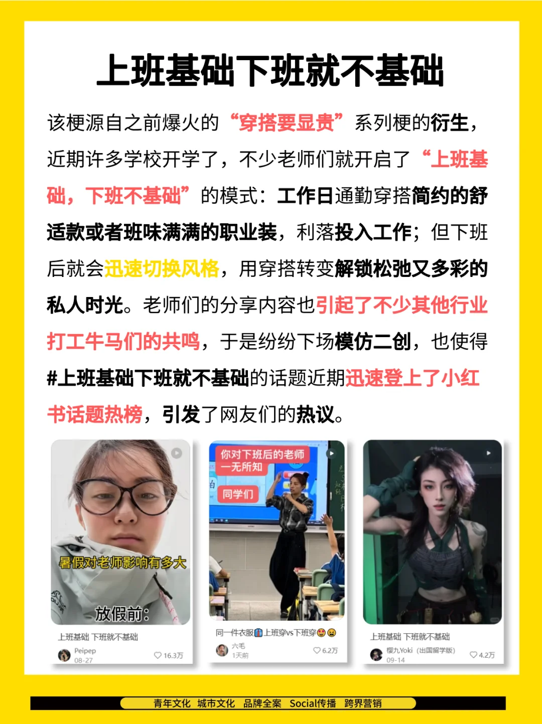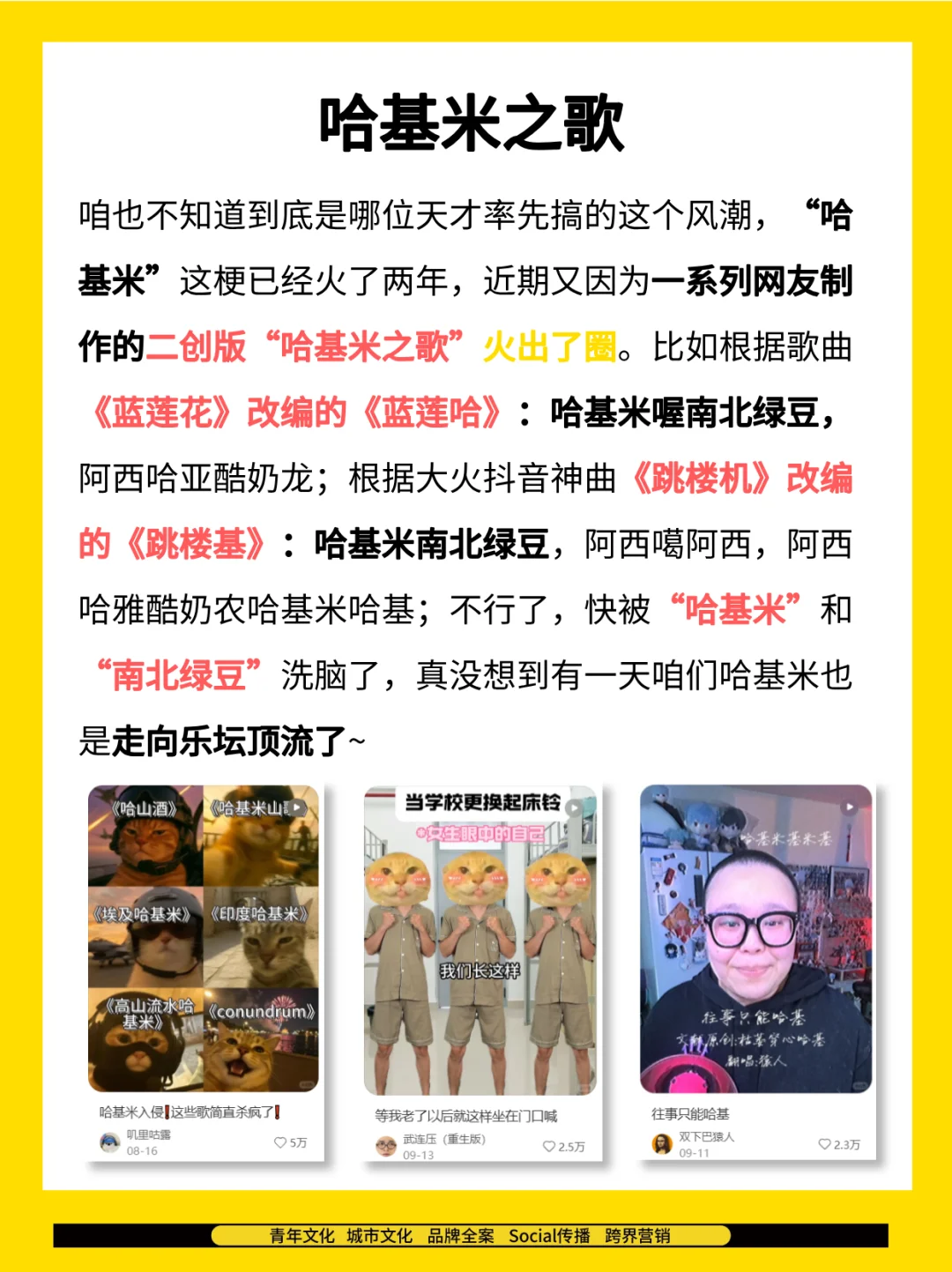 🔎年轻人最近在关注什么? 热词热梗指南,带你走进年轻人的世界! 🔥「上班基础下班就不基础」,赶紧放假啊; 🔥「吉隆坡的天气它是翻云又覆雨」,让我看看是谁在想我; 🔥到底是哪位天才整的「哈基米之歌」,现在满脑子都是哈基米和南北绿豆; *图源网络 每周关注快活Lab工作室,后面会持续更新更多营销案例、行业研究、青年洞察等相关内容干货哦!