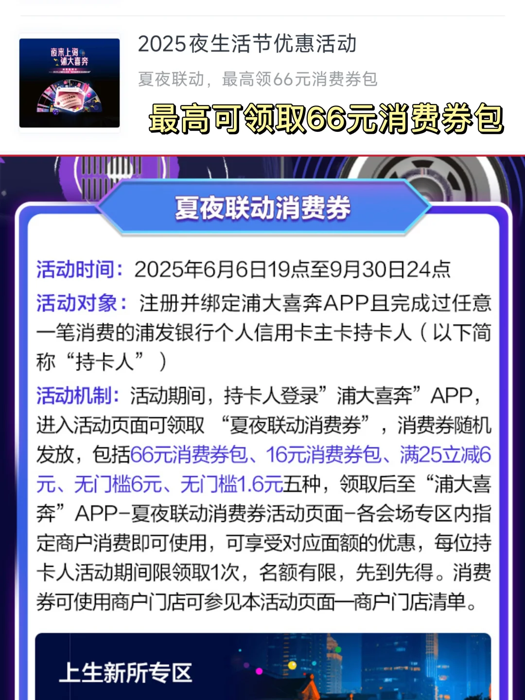 👉🏻还有 “夏夜联动消费券”,上浦大喜奔APP,最高随机可领取66元消费券包哦。夏天都是等天黑才出门,夜生活也很精彩哦~