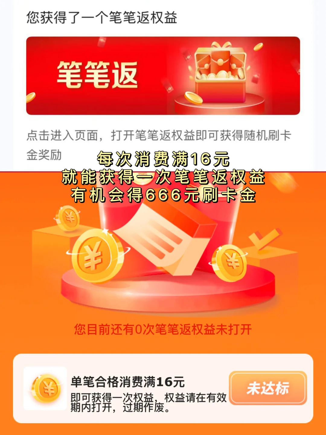 👉🏻笔笔返活动!每次消费满16元,就能获得1次笔笔返权益,幸运的人有机会得666刷卡金。消费后会有实时消息推送,点击领取权益就好啦~