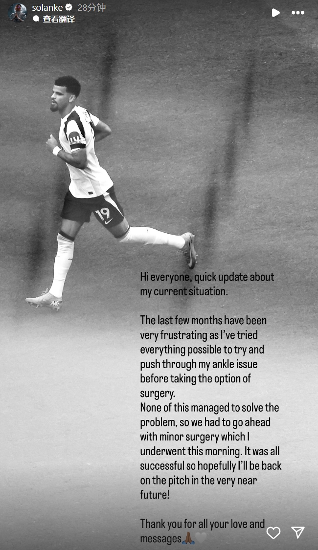 索兰克:“大家好,给大家快速更新一下我目前的情况。过去的几个月非常令人沮丧,因为我尝试了所有可能的办法来解决我的脚踝问题,但都没有成功,所以今天早上我不得不接受了小手术。手术很成功,希望很快就能回到球场上!感谢大家的关心和支持。”