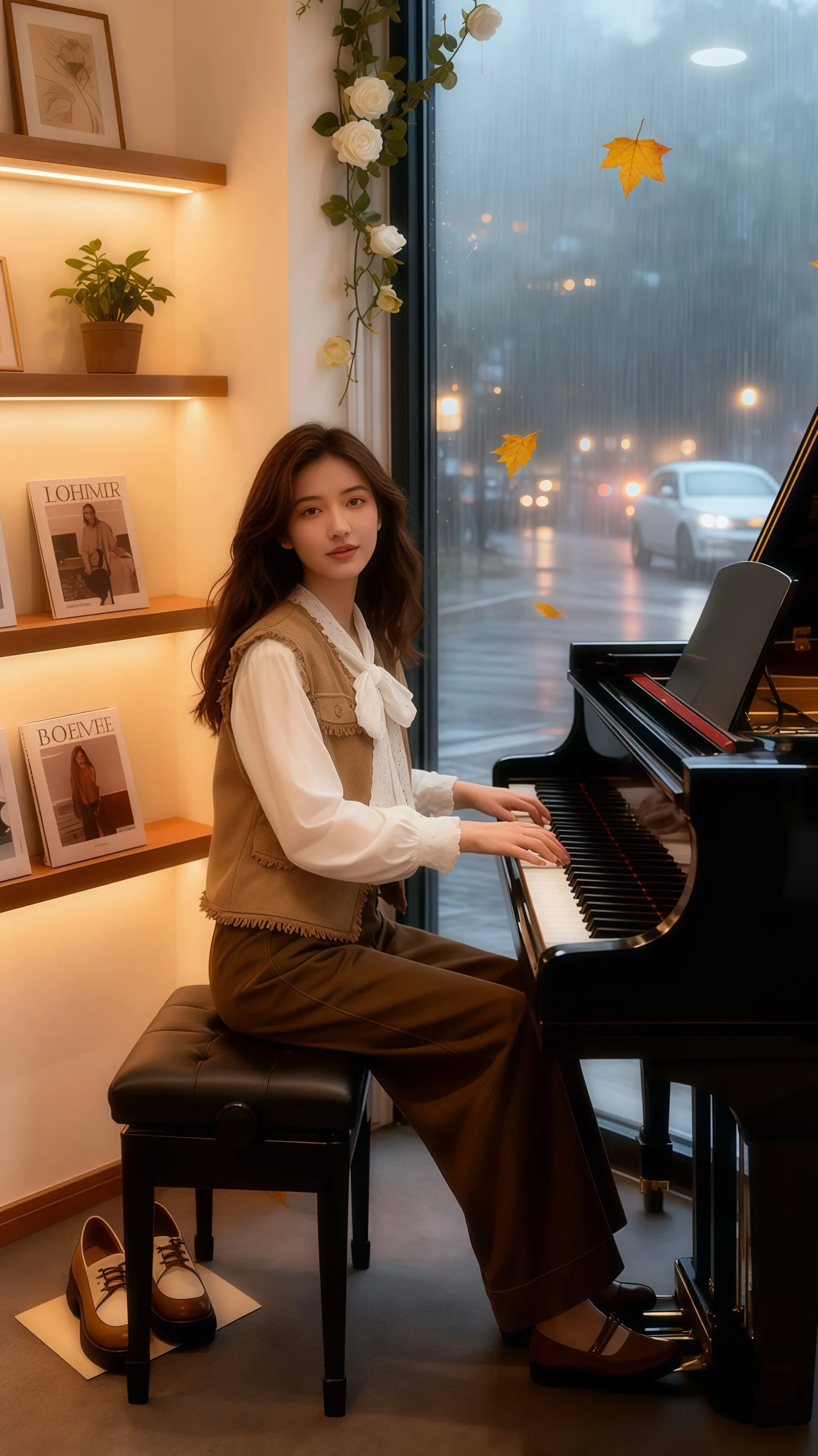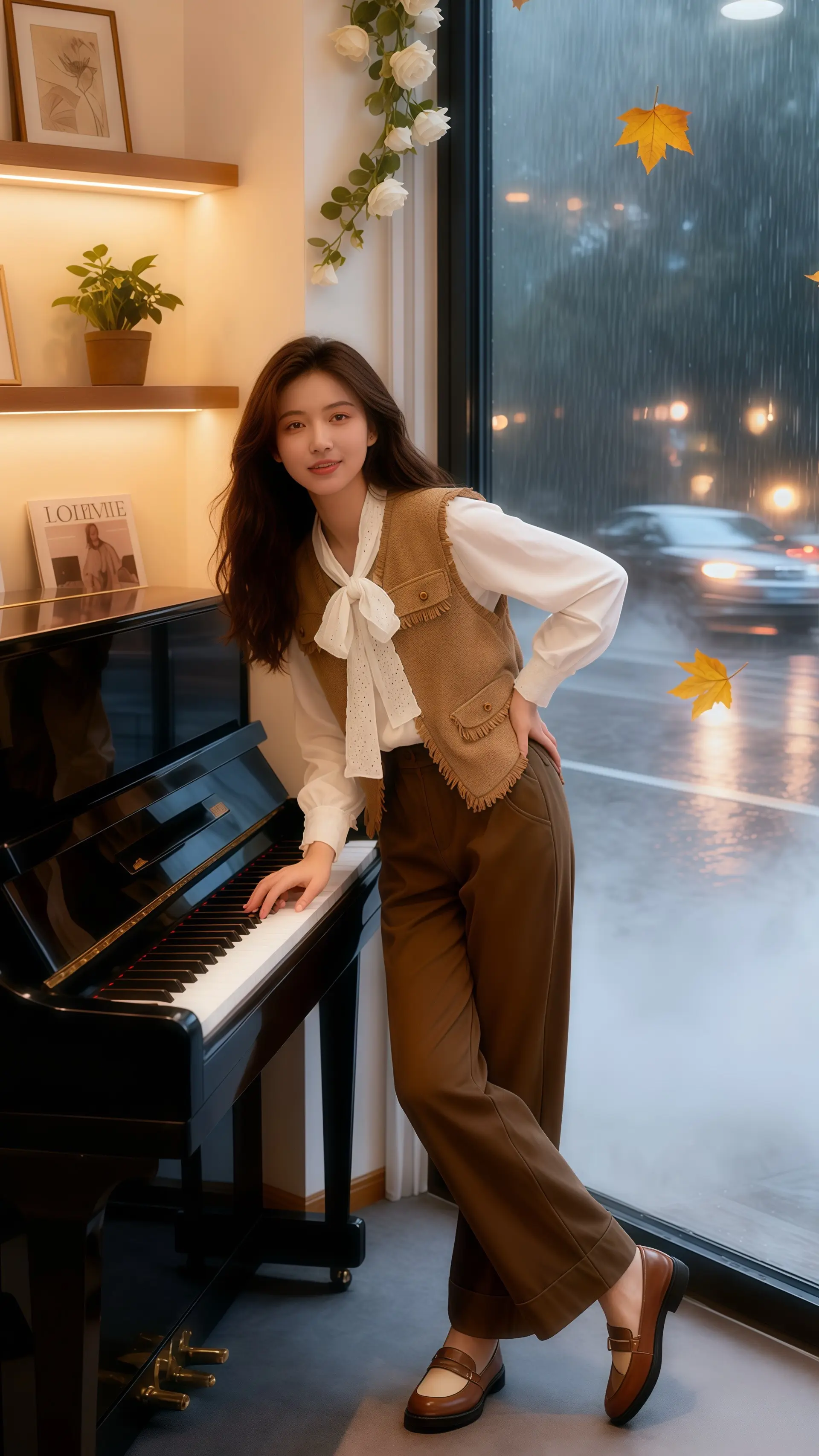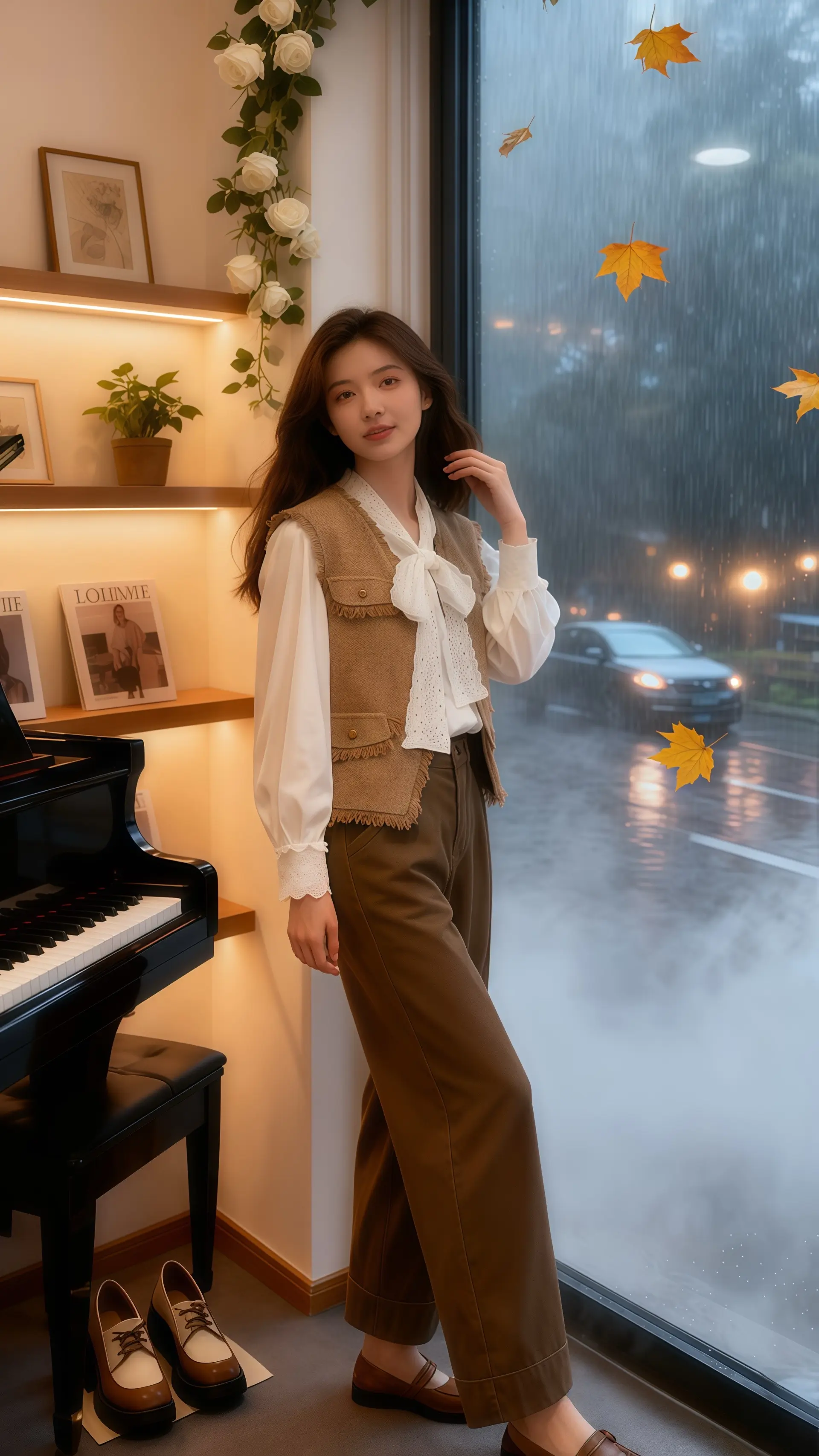 她穿着高级感小香风马甲三件套,流苏边的驼色马甲与蕾丝白衬衫、阔腿裤的组合,在黑色豪华钢琴的映衬下,将25岁女性的优雅与精致尽数展现。暖光架子上的绿植、画框与时尚杂志,为空间铺就轻奢底色。落地窗顶垂落的白色玫瑰藤,与窗外雨雾朦胧的秋景相映成趣——斑驳灯光里,金黄枫叶与行驶的汽车在雨幕中交织,她或单手轻抚钢琴,或端坐琴前弹奏,每一个姿态都在小香风的细腻与钢琴的典雅间,谱写出秋日独有的高级氛围感。