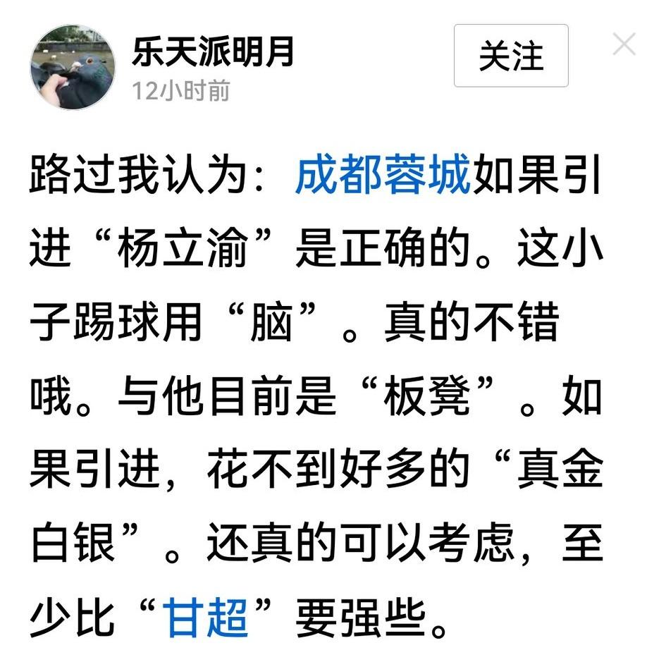 不知哪来的消息,有球迷开始帮蓉城早早引进杨立渝。 杨立渝高光亮眼的时段是恒大金