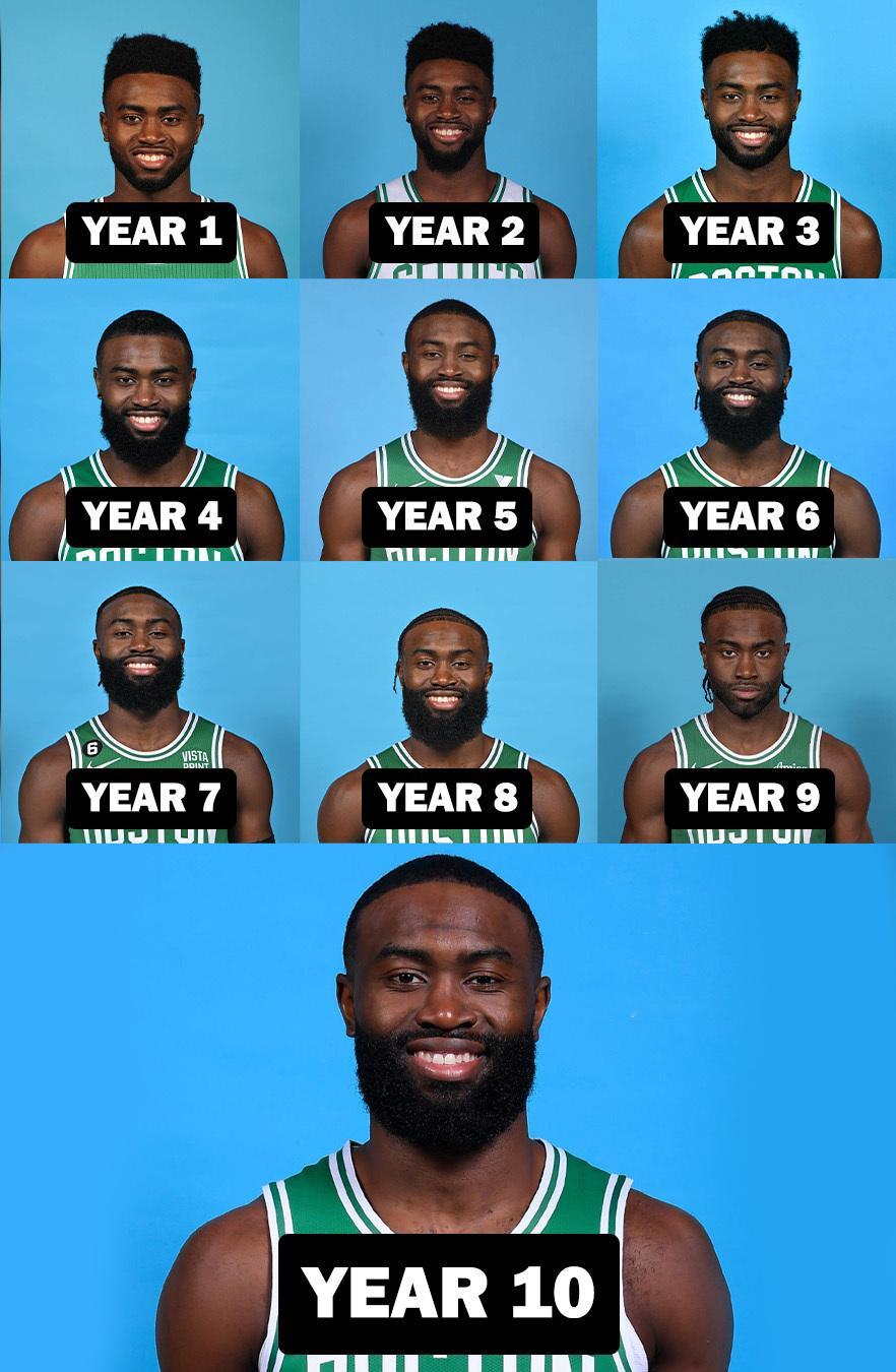 杰伦-布朗的第十年,头发短了,胡子长了。