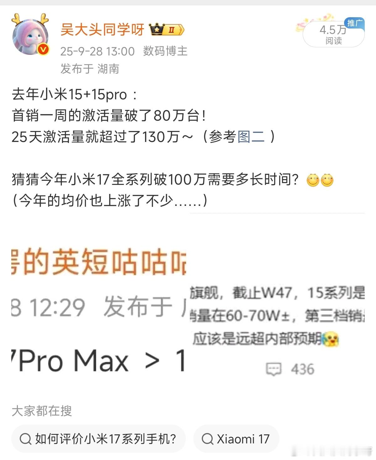 卢总刚刚发完确认,小米17系列目前的销量已轻松破100万了~(距离正式开售仅过5天)