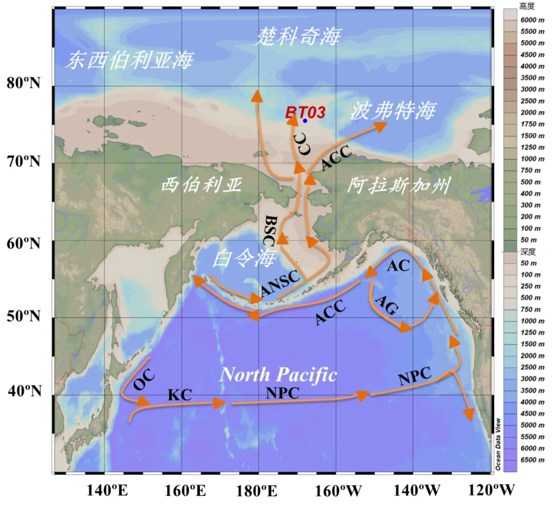 ([一R])对于释放到海洋中的福岛核事故源放射性铯(CsF), 其中大约70% 随黑潮延伸体和较重的中部模态水(D-CMW)沿着表层和次表层向东北太平洋扩散, 造成北美西部海域CsF高于东亚边缘海约1个数量级. 进入东北太平洋的CsF核心分布于亚北极海域200m水深以浅. CsF羽流大约用时4~5年到达北美西海岸, 并在亚北极环流携带下约用时8~9年完成一个循环而返回到原出发地黑潮-亲潮交汇区.