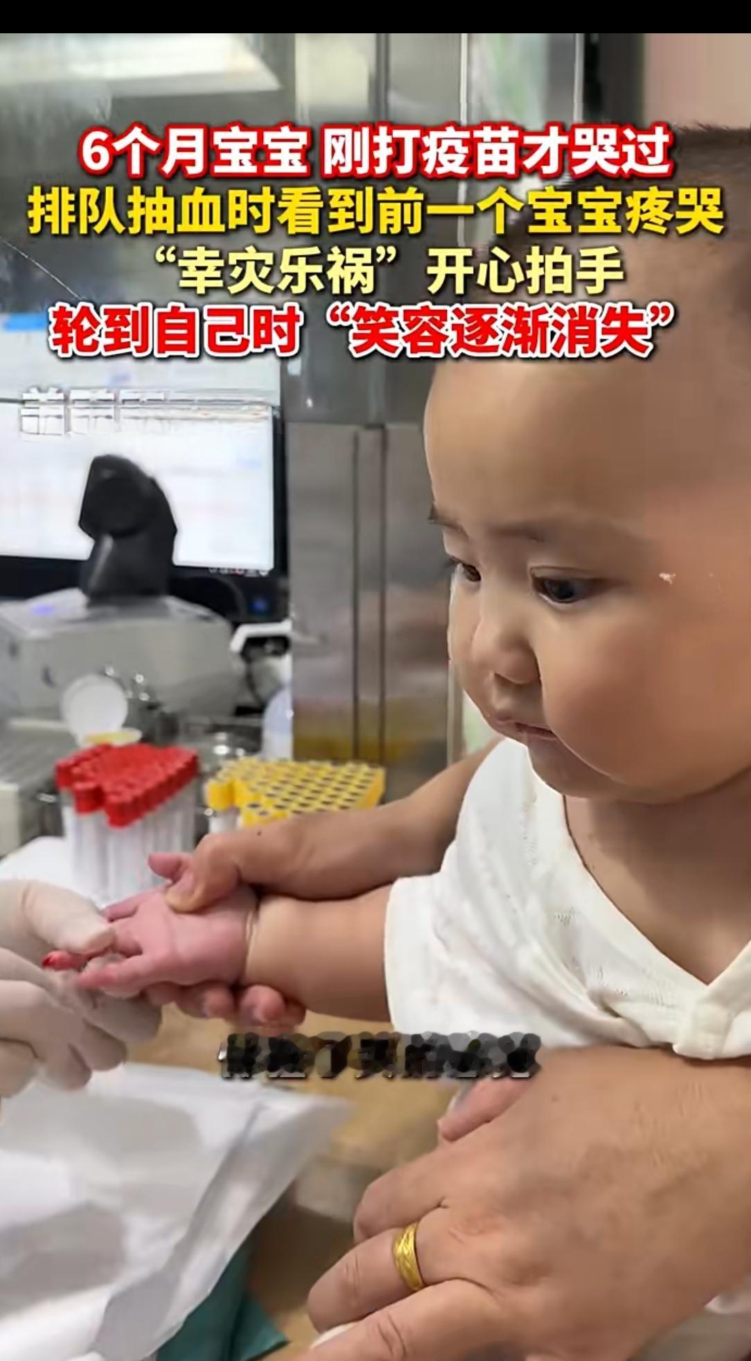 6月大宝宝看别人抽血笑出小手,轮到自己秒变脸!这反差太真实 医院采血室里,6