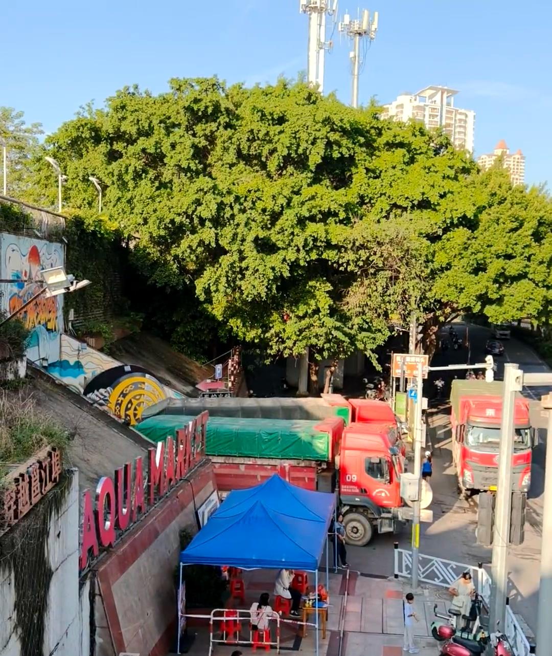 10月2日早南宁邕江。 大卡车已到位,严阵以待。我记得去年民生码头水漫出来了,今年没有漫出来,青环路去年被淹了,今年还没,应该还没去年水位高。