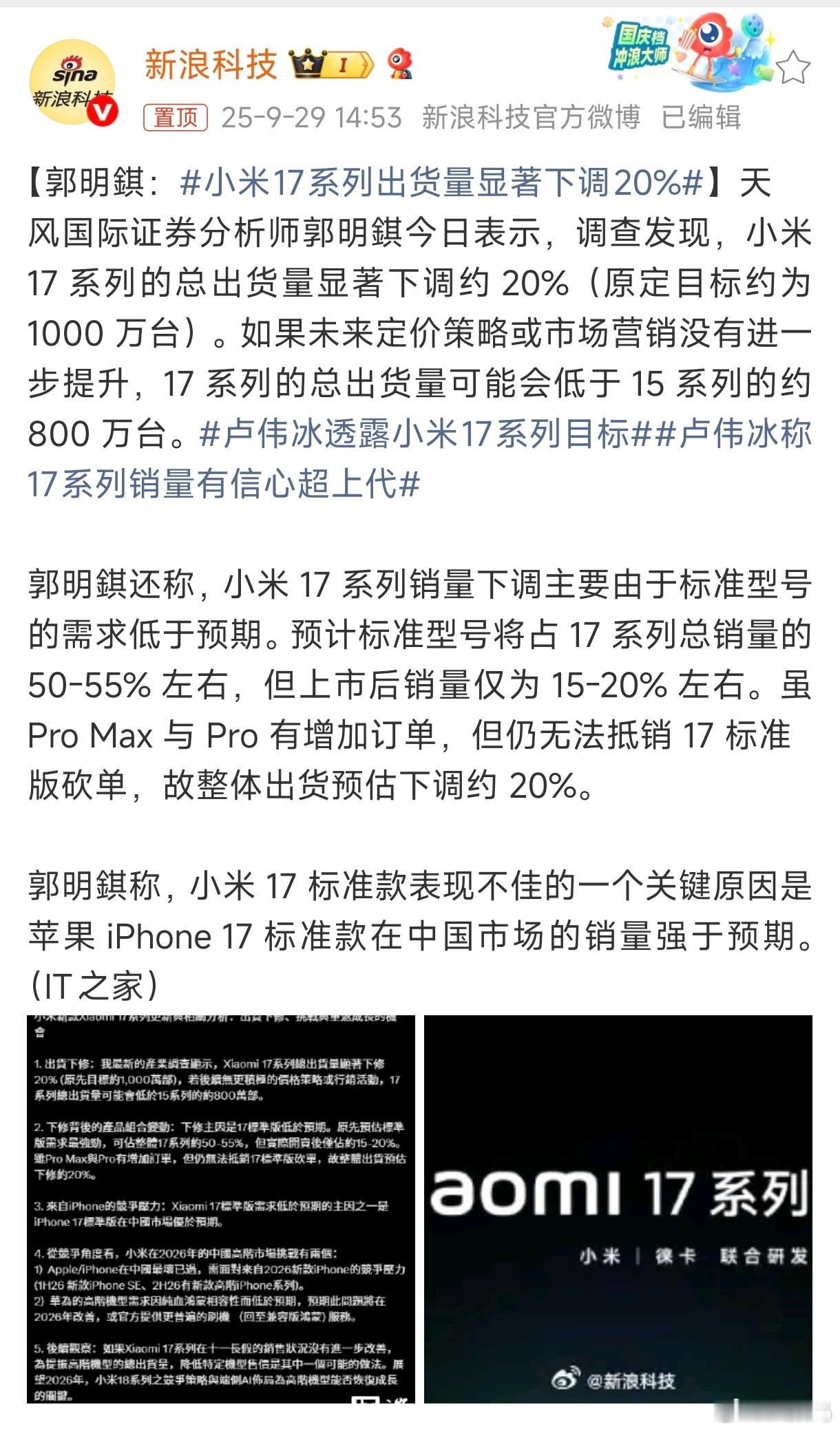卢伟冰来打脸了,特别是那位所谓的国际证券分析师郭明𫓹,去年预测小米汽车5万销量被打脸,今年预测小米17系列不及小米15,总出货量下调20%,这不又被打脸了吗?
