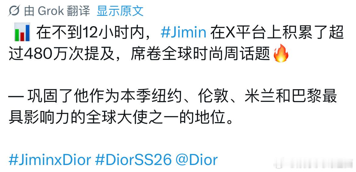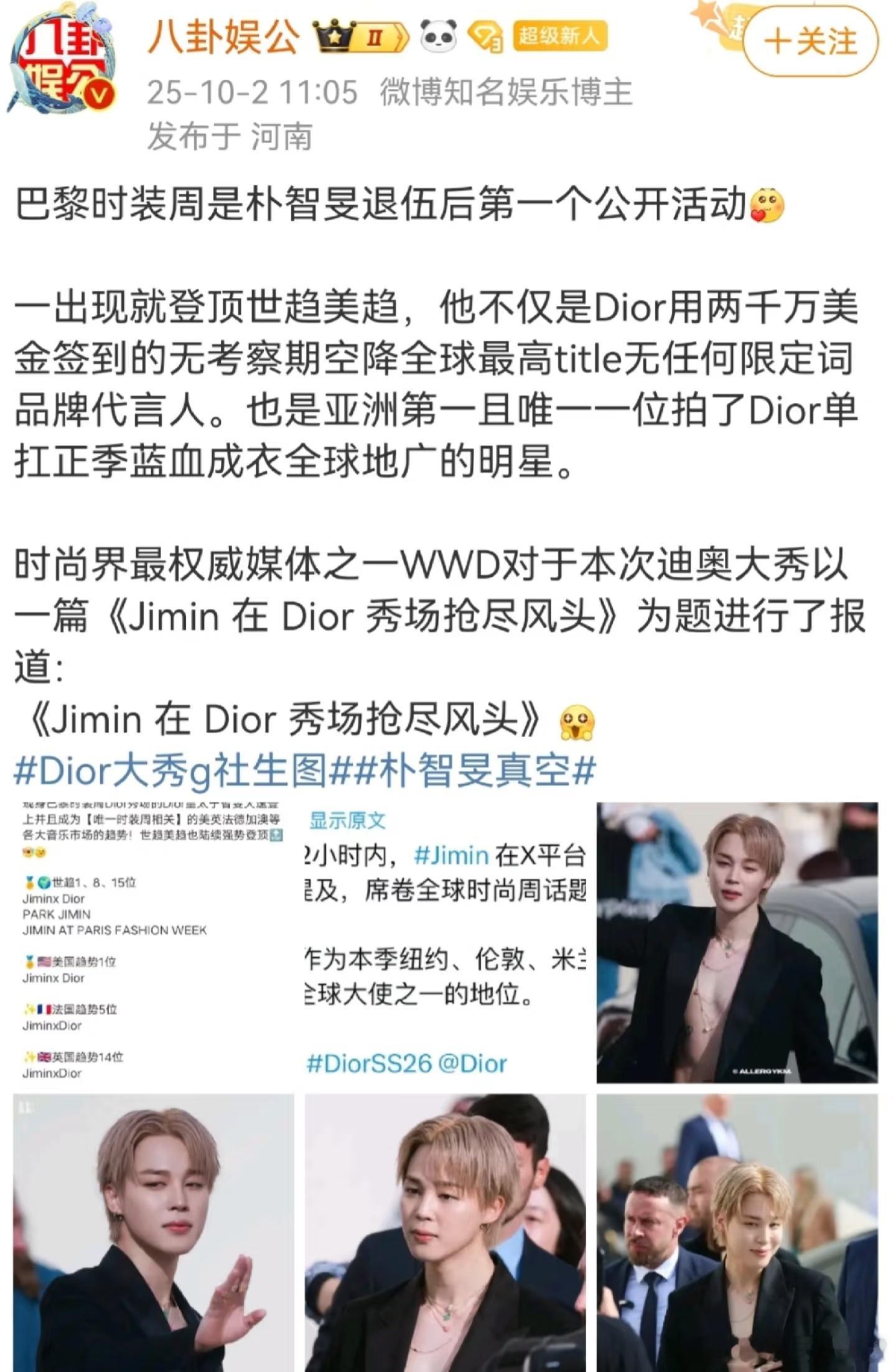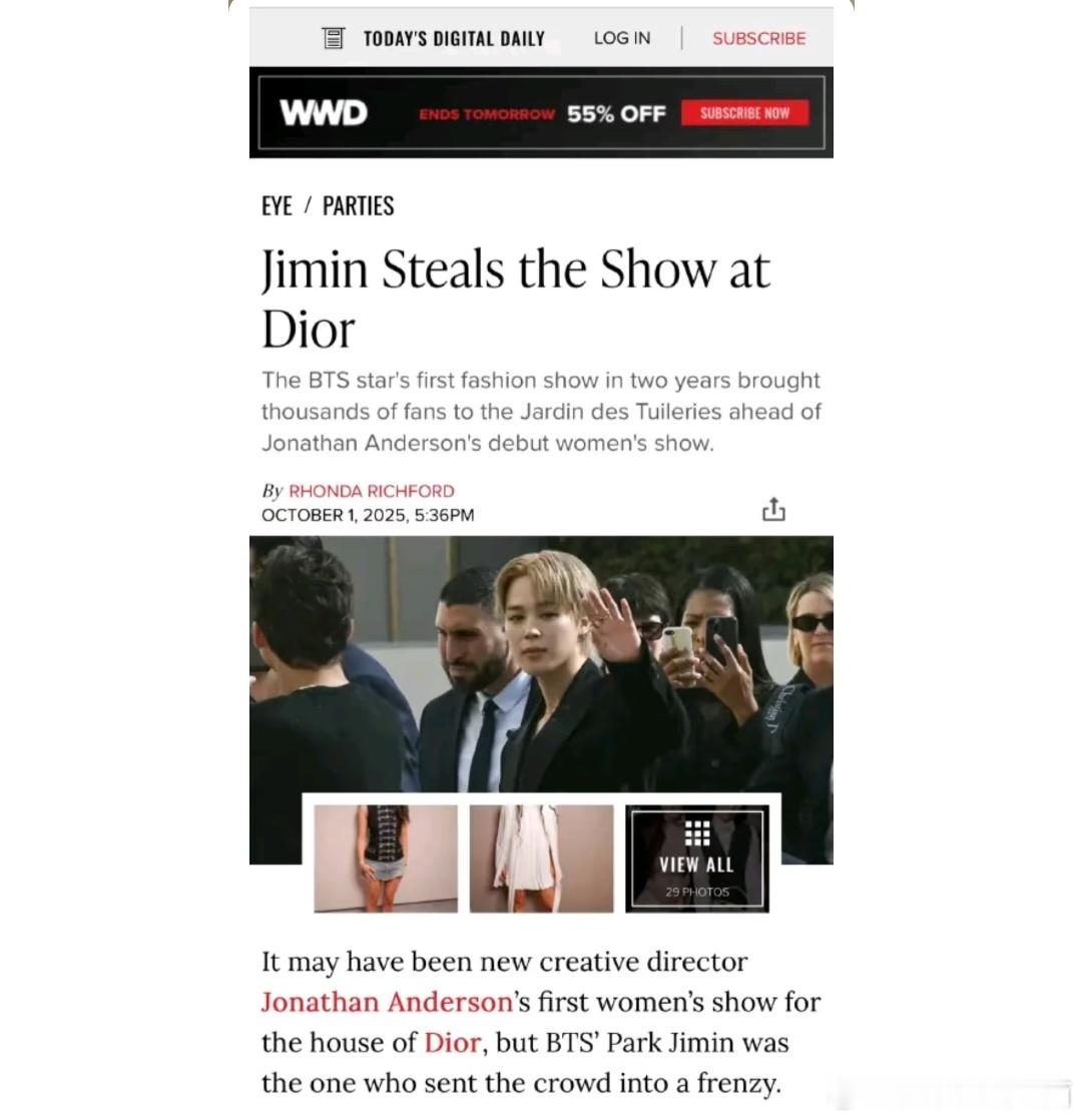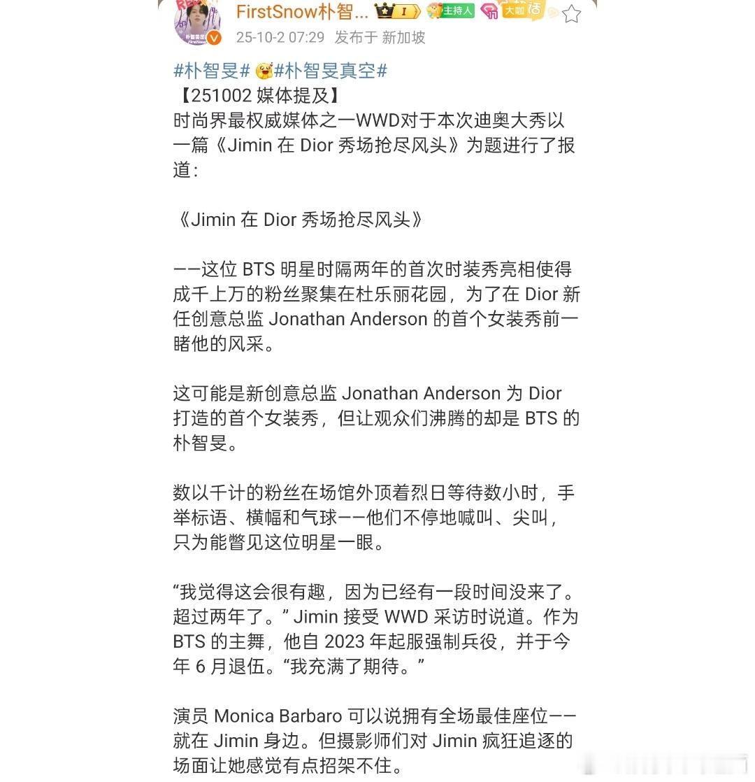 英国三大报纸之一的《卫报》单独提及朴智旻英国三大报纸之一的《卫报》在报道迪奥大秀、有关乔纳森·安德森 (Jonathan Anderson) 的 2026 年春夏迪奥系列的文章中刊登了一张 Jimin 的惊艳照片🔥且智旻是文章中唯一提到的迪奥大使和名人🥰